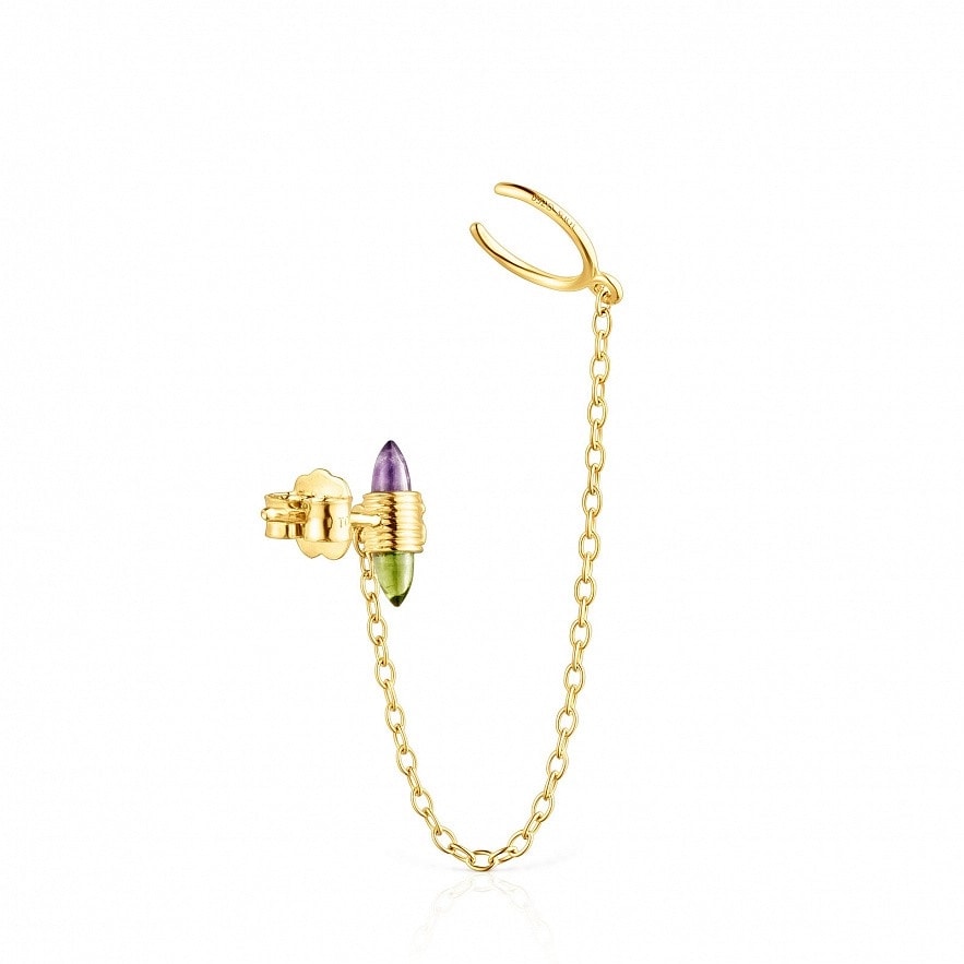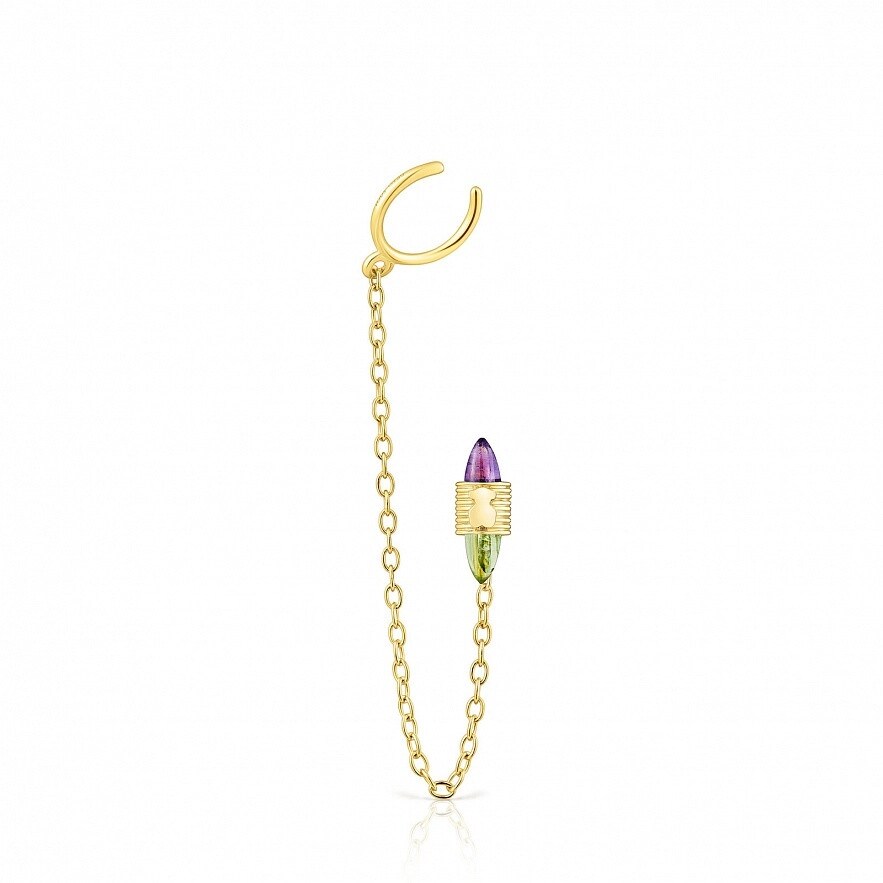 Золотая кафа 750 пробы TOUS Lure с драгоценными камнями и с деталью мишки 2,8 мм в центре мотива, соединяющего аметист и перидот. Размер драгоценных камней: 7,5 х 2,6 мм. Размер мотива: 15 мм. Длина цепочки: 60 мм. Отверстие для ушной раковины: 4 мм. Застежка-штифт.