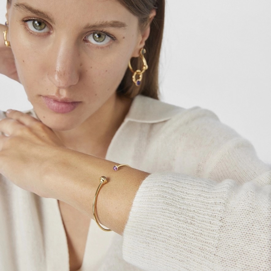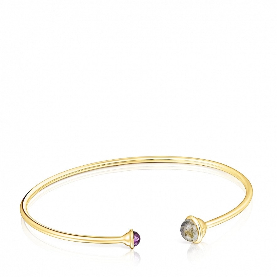 Браслет TOUS Plump из серебра 925 пробы с покрытием Vermeil с шарообразными деталями с лабрадоритом и аметистом на концах браслета. Размер камней: лабрадорит 6-6,5 мм, аметист 4-4,5 мм. Толщина браслета: 2 мм. Vermeil : серебро с покрытием золота 18 карат.
