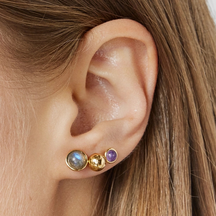 Комплект из трех сережек TOUS Plump из серебра 925 пробы с покрытием Vermeil . Лабрадорит размером 6-6,5 мм. Аметист размером 4-4,5 мм. Шарик из серебра 925 пробы с покрытием Vermeil диаметром 6 мм с мишкой размером 3 мм. Застежка-пусет. Vermeil : серебро с покрытием золота 18 карат.