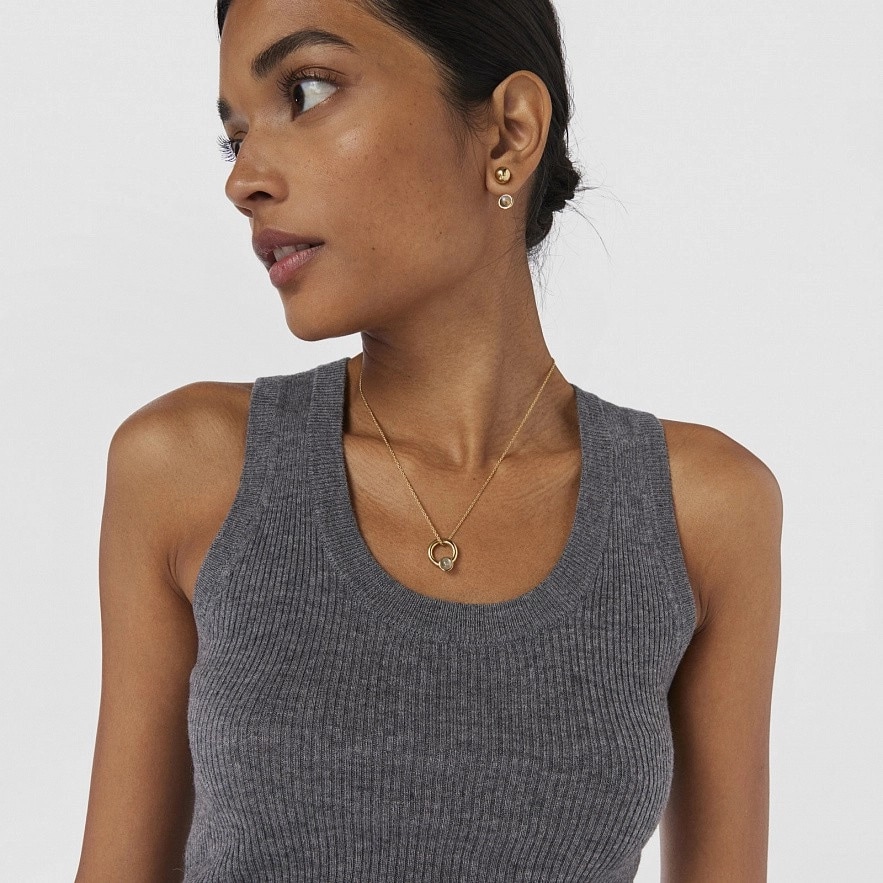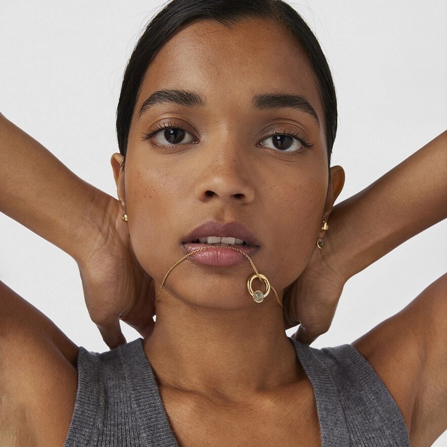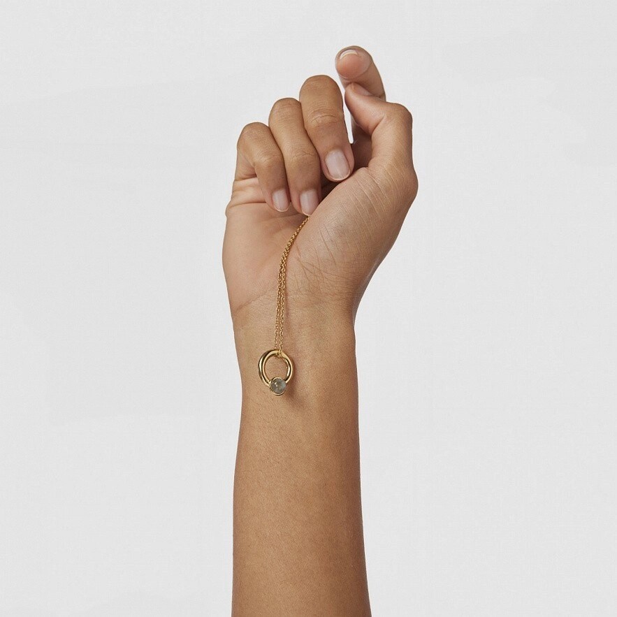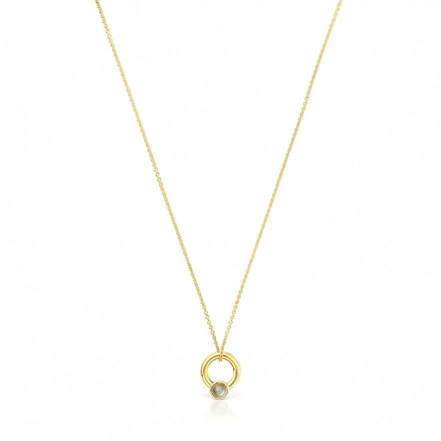 Колье TOUS Plump из серебра 925 пробы с покрытием Vermeil с подвешенным "кольцом" с лабрадоритом размером 6-6,5 мм. Диаметр "кольца": 16 мм. Длина колье: 45 см. Vermeil : серебро с покрытием золота 18 карат.