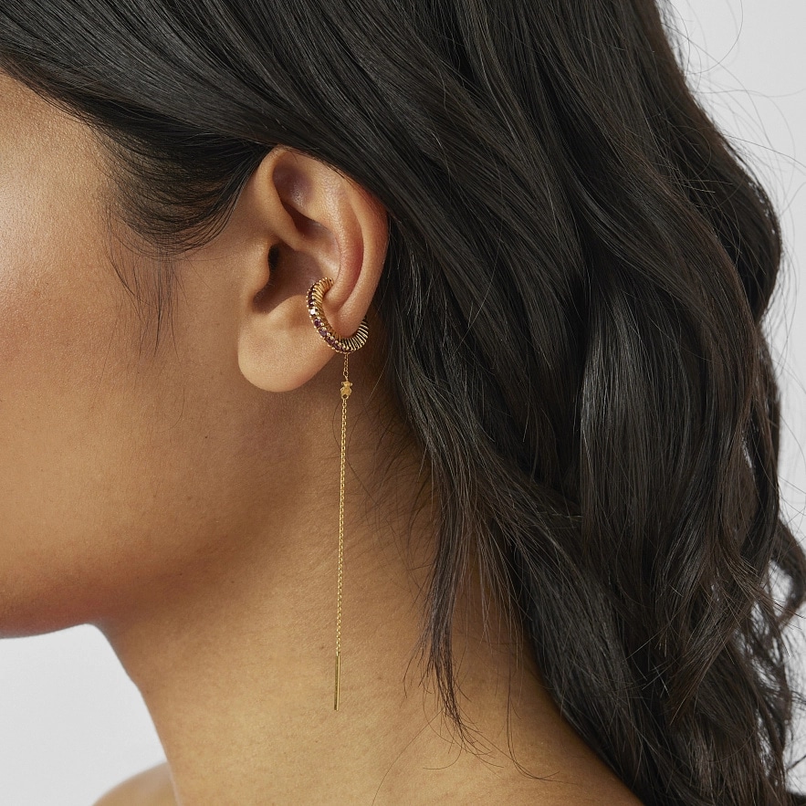 Серьги-каффы TOUS Straight из серебра 925 пробы с длинной цепочкой и мотивом медведя, а также каффой с родолитами, расположенными по верхнему краю. Благодаря длинной цепочке вы можете создавать любую форму в зависимости от ваших пирсингов.