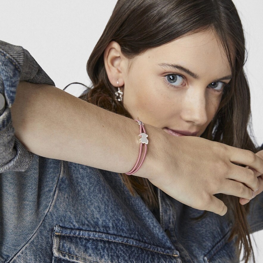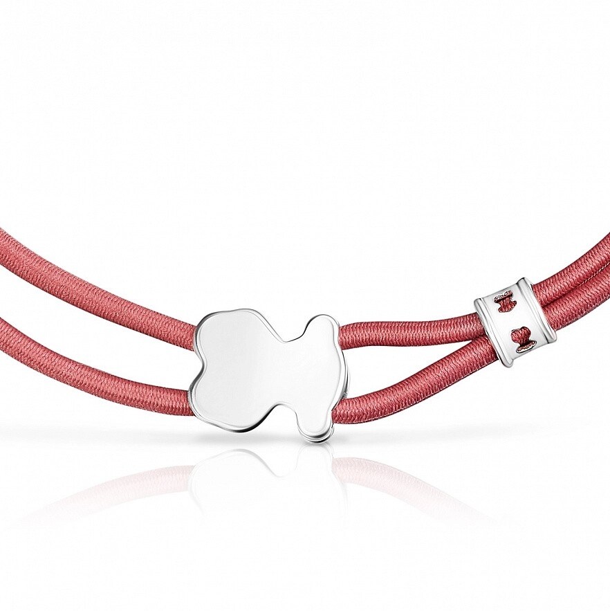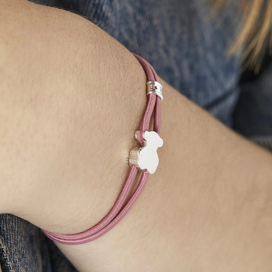 Розовый эластичный браслет TOUS Sweet Dolls размером 17 см с серебряным мишкой. Серебро 925 пробы.
