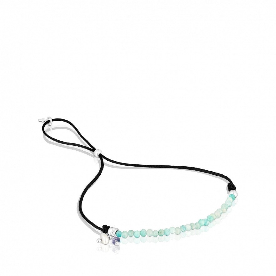 Браслет TOUS Camille из черного нейлона и серебра 925 пробы с амазонитами размером 2-2,5 мм и подвеской с культивированной жемчужиной 3-3,5 мм и иолитом размером 3 мм.