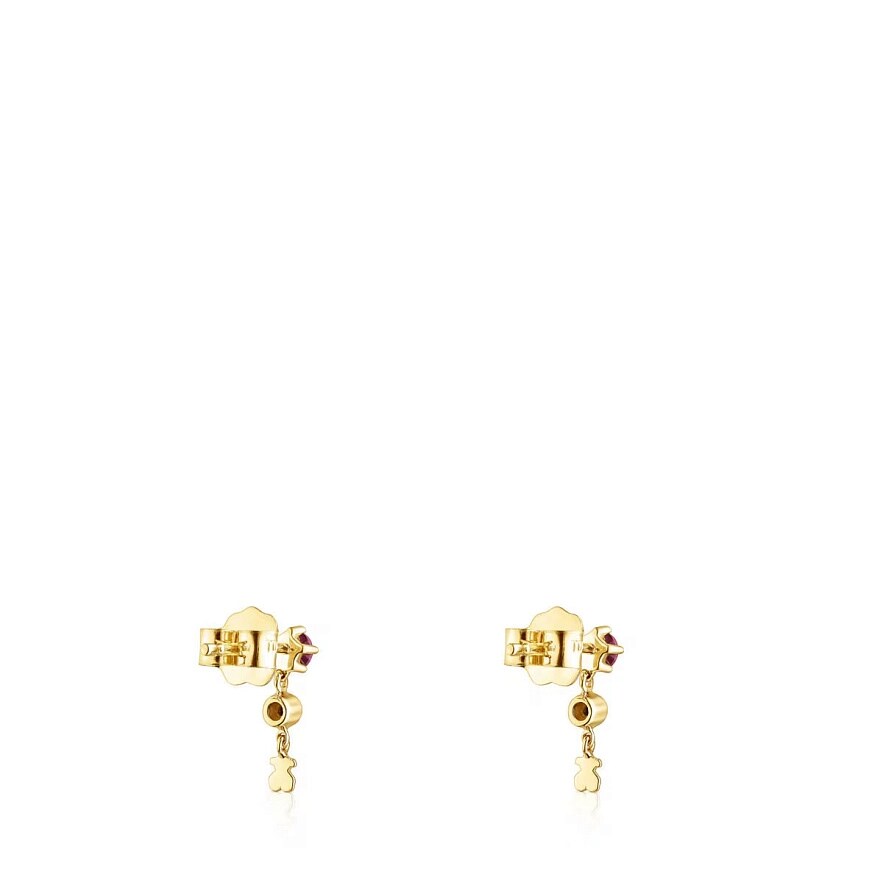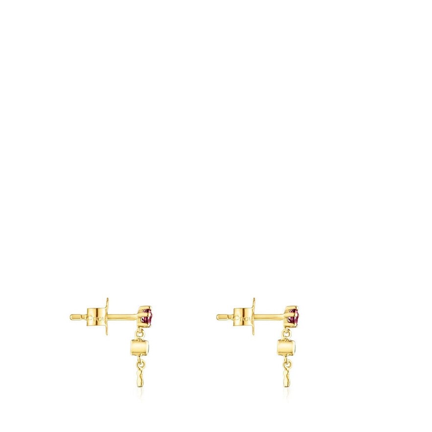 Серьги TOUS Cool Joy из 18-каратного золота с родолитом 2,5 мм, хромдиопсидом 1,5 мм и подвеской в форме медвежонка 2,5 мм. Застежка-пусет.