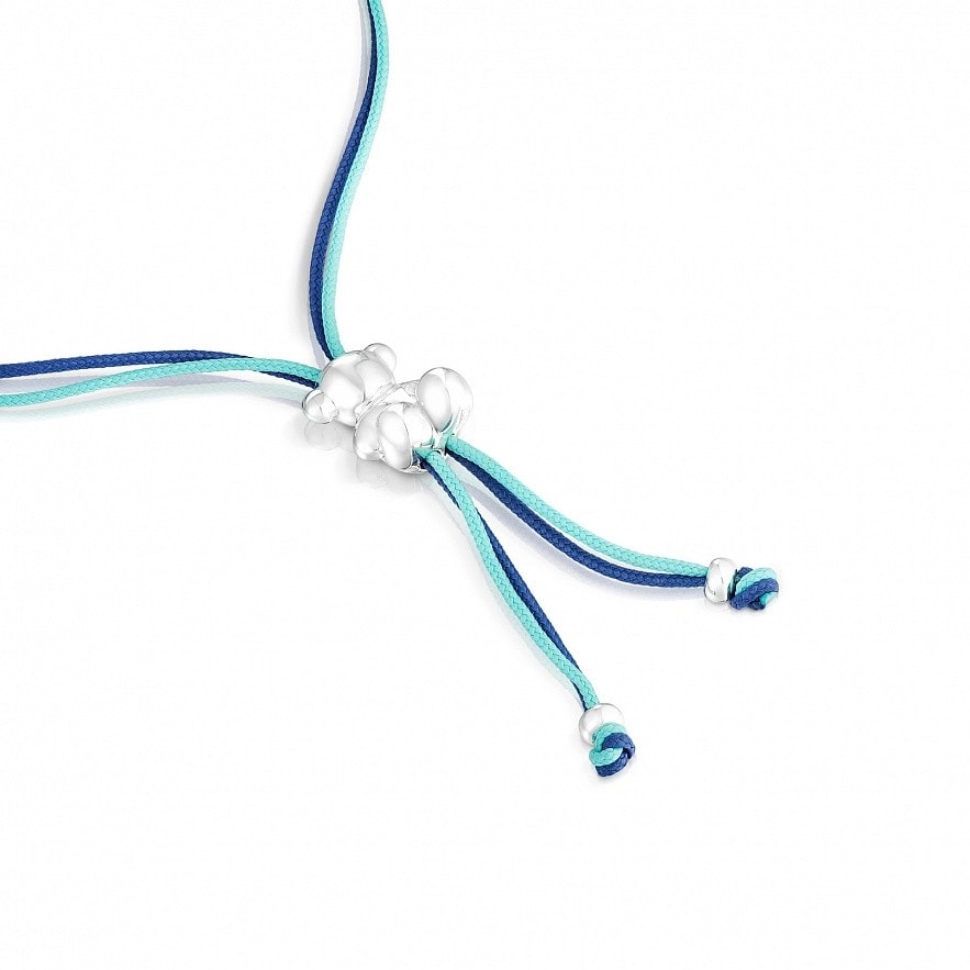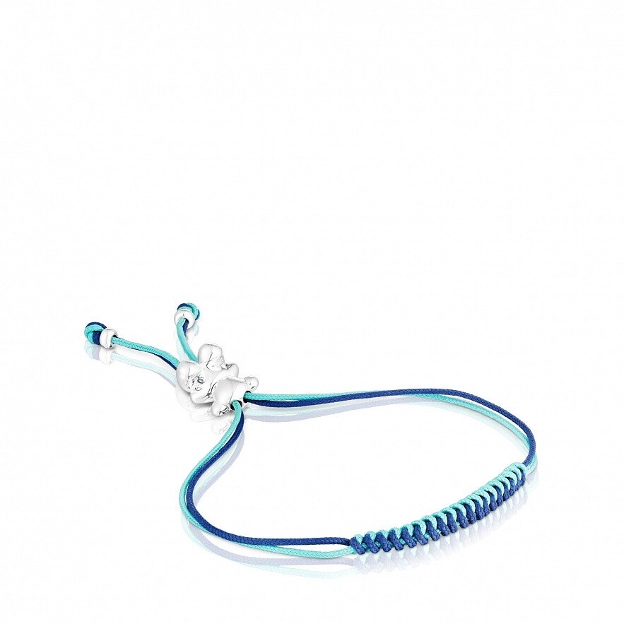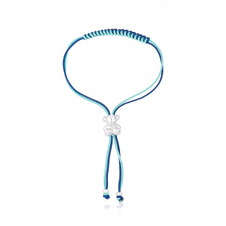 Браслет TOUS Bold Bear с двумя переплетенными шнурами из полиэстера бирюзового и темно-синего цветов с подвеской в виде медведя из стерлингового серебра. Размер медведя: 11 мм. Общая длина: 22 см. Раздвижная застежка в форме медведя.