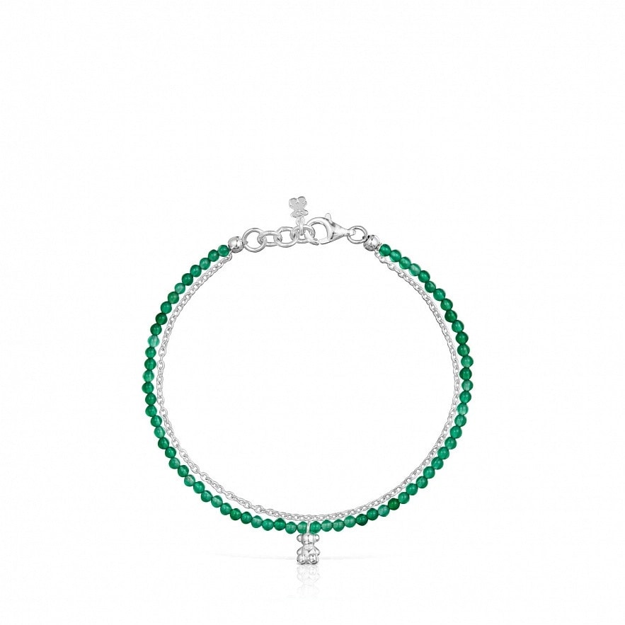 TOUS Bold Bear браслет из серебра 925 пробы и обработанного зеленого халцедона, состоящий из двух цепочек, соединенных на концах. Одна цепочка серебряная, а другая из драгоценных камней с серебряной подвеской в виде медведя. Размер драгоценных камней: 2-2,5мм. Размер медведя: 5,35мм. Длина браслета: 17,5 см. Застежка-лобстер.