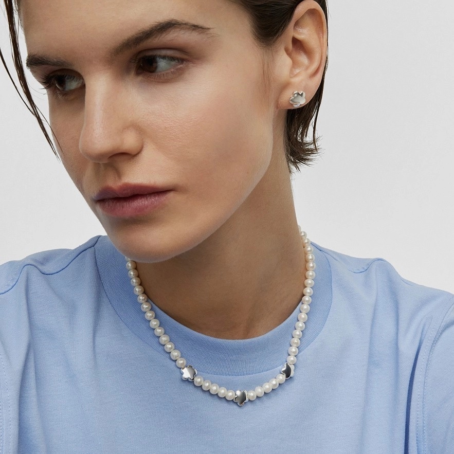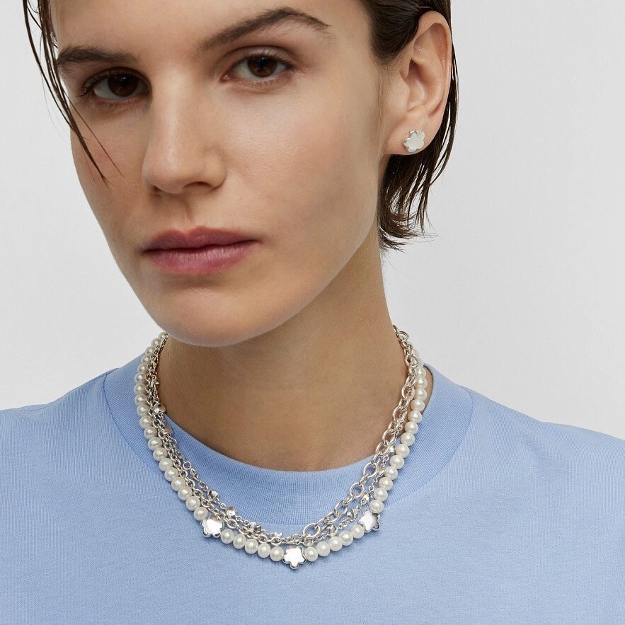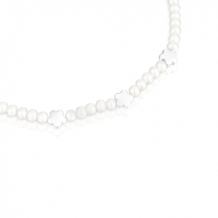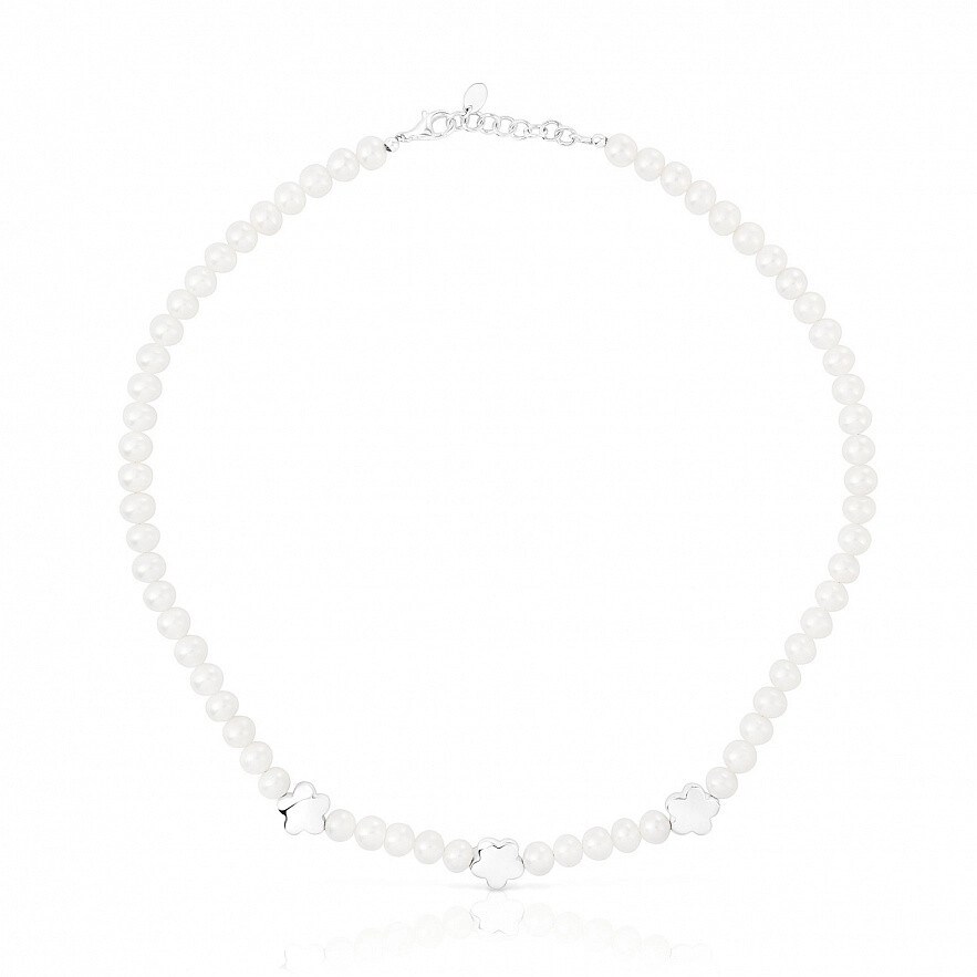 Колье TOUS Bold Motif из стерлингового серебра с культивированным жемчугом и тремя чередующимися цветочными мотивами. Размер культивированного жемчуга: 6-6,5 мм. Размер цветка: 10,5 мм. Длина колье: 42-45 см. Застежка пружинное кольцо.