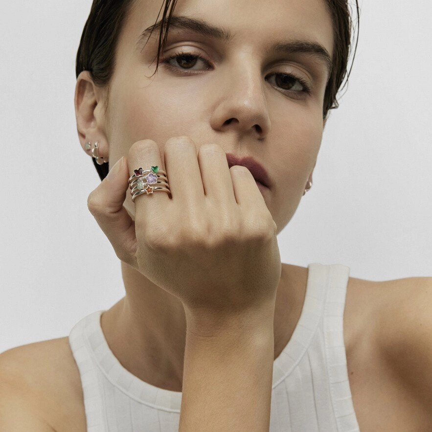 Широкое кольцо TOUS Bold Motif из стерлингового серебра с мотивами и драгоценными камнями на внутренней стороне силуэтов. Размер камней: кабошон аметиста 5,6 мм (цветок), обработанный халцедон 4 мм (сердце), кабошон ограненного сердолика 4 мм (звезда), кабошон амазонита 4 мм (медведь) и кабошон родолита 4 мм ограненный (бабочка). Ширина кольца: 19 мм. Толщина кольца: 1,5 мм.