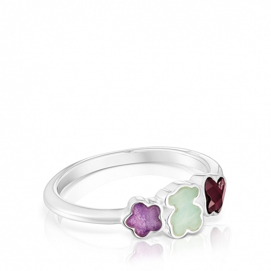 Кольцо TOUS Bold Motif из стерлингового серебра с мотивами и драгоценными камнями на внутренней стороне силуэтов. Размер драгоценных камней: кабошон аметиста 4 мм (цветок), кабошон амазонита 5,4 мм (медведь) и ограненный кабошон родолита 4 мм (бабочка). Ширина нижнего кольца: 1,5 мм. Толщина кольца: 1,5 мм.