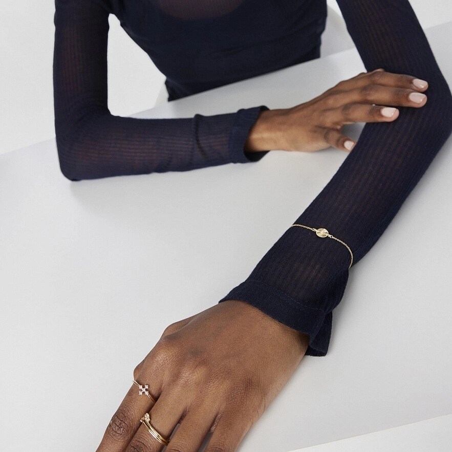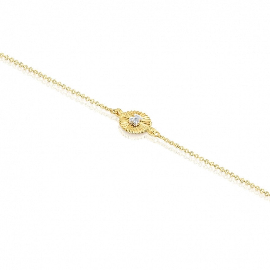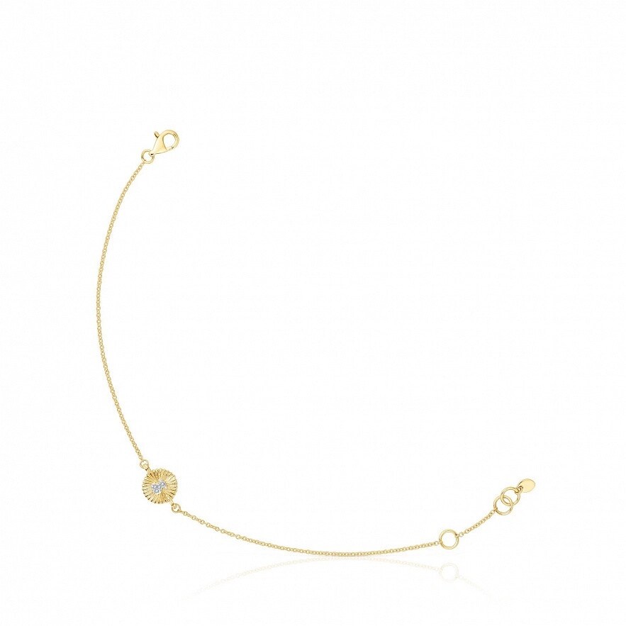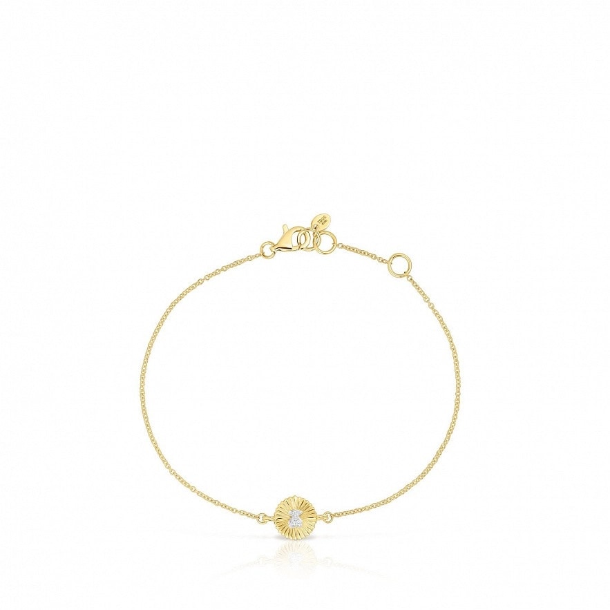 Браслет TOUS Iris Motif из 18-каратного золота и медаль с бриллиантами весом 0,01 карата, образующих силуэт медведя в центре. Бриллиантовая огранка: бриллиант. Качество бриллианта: H/SI. Размер медали: 8 мм. Размер медведя: 3,5 мм. Длина браслета: 16,5-17,5 см. Застежка на карабине.
