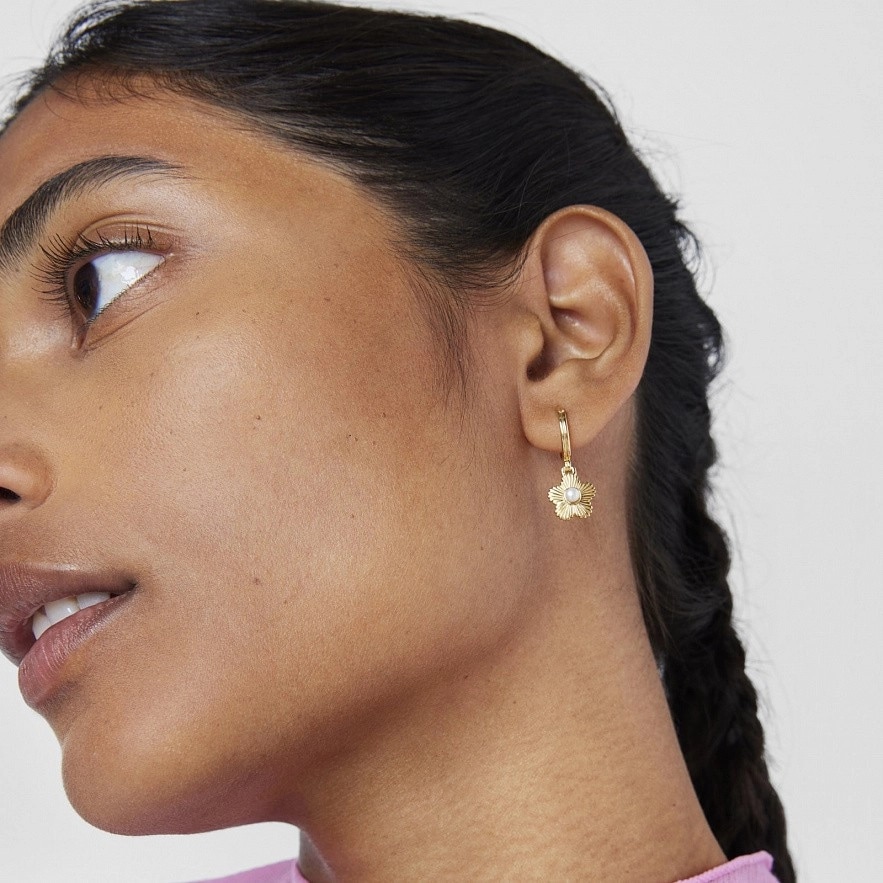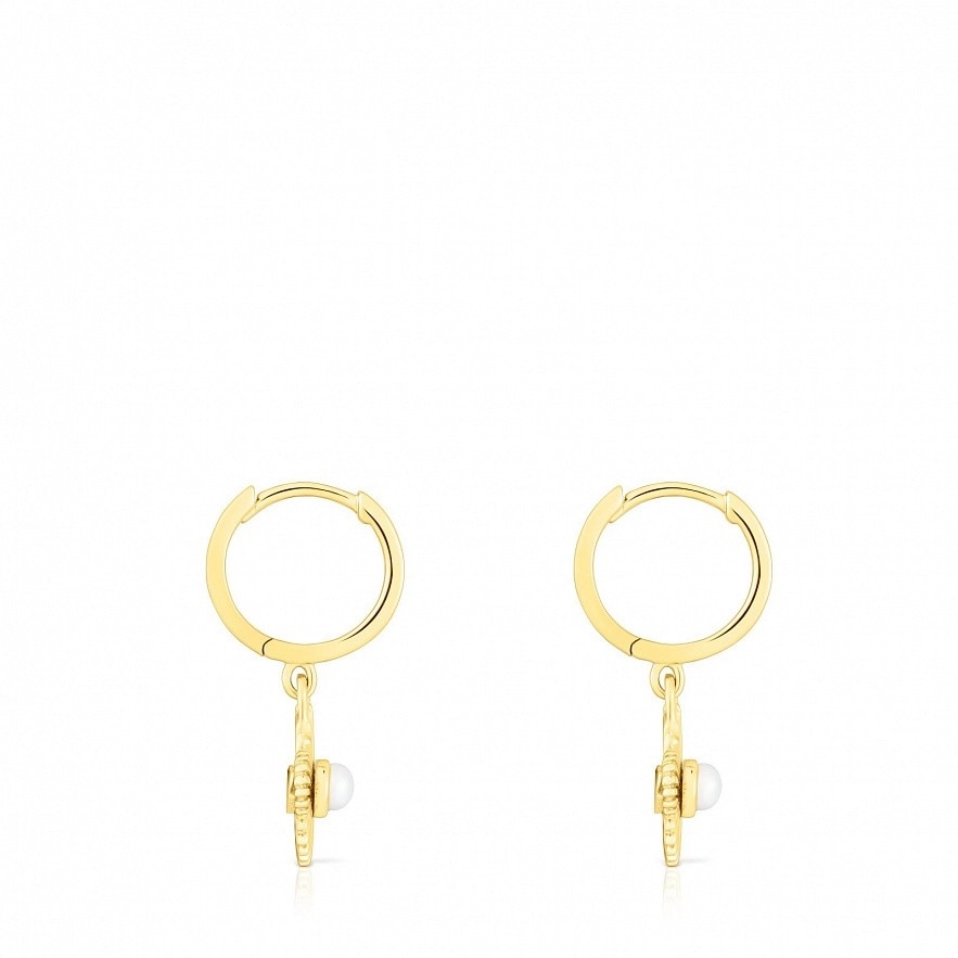 TOUS Iris Motif серьги-кольца из серебра 925 пробы с покрытием Vermeil с висячим цветком и культивированным жемчугом. Размер подвески: 10мм. Размер культивированного жемчуга: 3мм. Диаметр кольца: 10мм.
