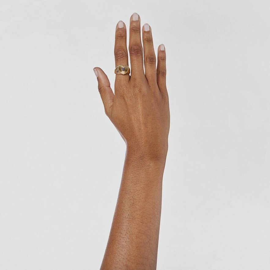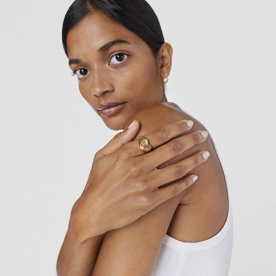 TOUS Iris Motif перстень-печатка из серебра 925 пробы с покрытием Vermeil с силуэтом сердца и еще одним сердцем в центре с родолитом. Размер мотива сердца 4,2мм. Верхняя ширина: 12мм. Нижняя ширина: 7,5мм. Толщина кольца: 3мм.