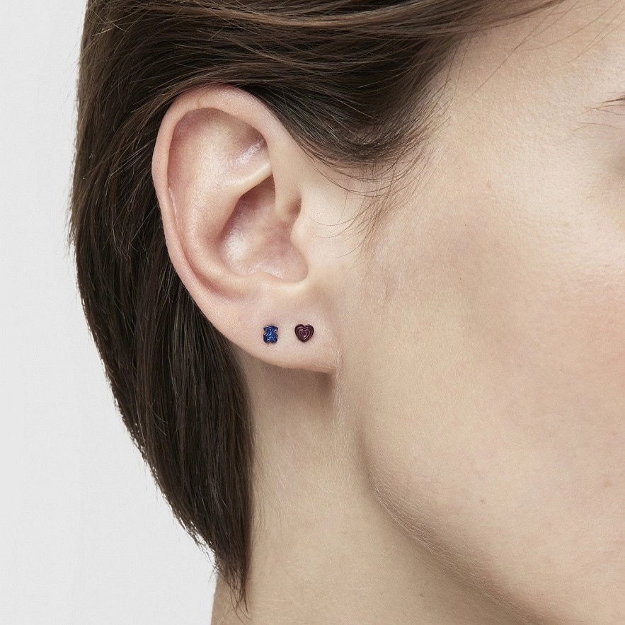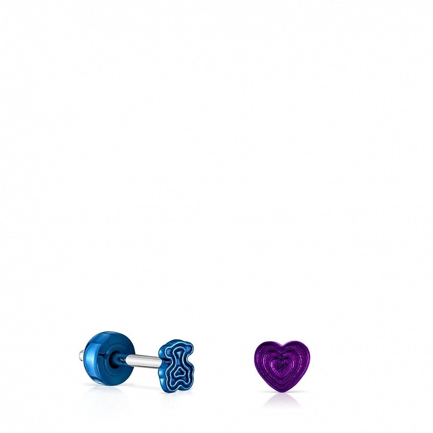 Набор из двух пирсингов для ушей TOUS Bickie из фиолетовой IP-стали с сердечком и синей IP-стали с мишкой. Длина стержня: 10 мм. Застежка-пусет.