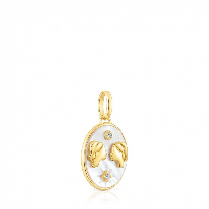 Подвеска TOUS гороскоп Близнецы из перламутрового серебра с перламутром и двумя топазами. На оборотной стороне кулона гравировка созвездия Большой Медведицы. Размер топаза: 1,2 мм. Размер подвески: 14 х 12 мм.Этот товар без цепочки.