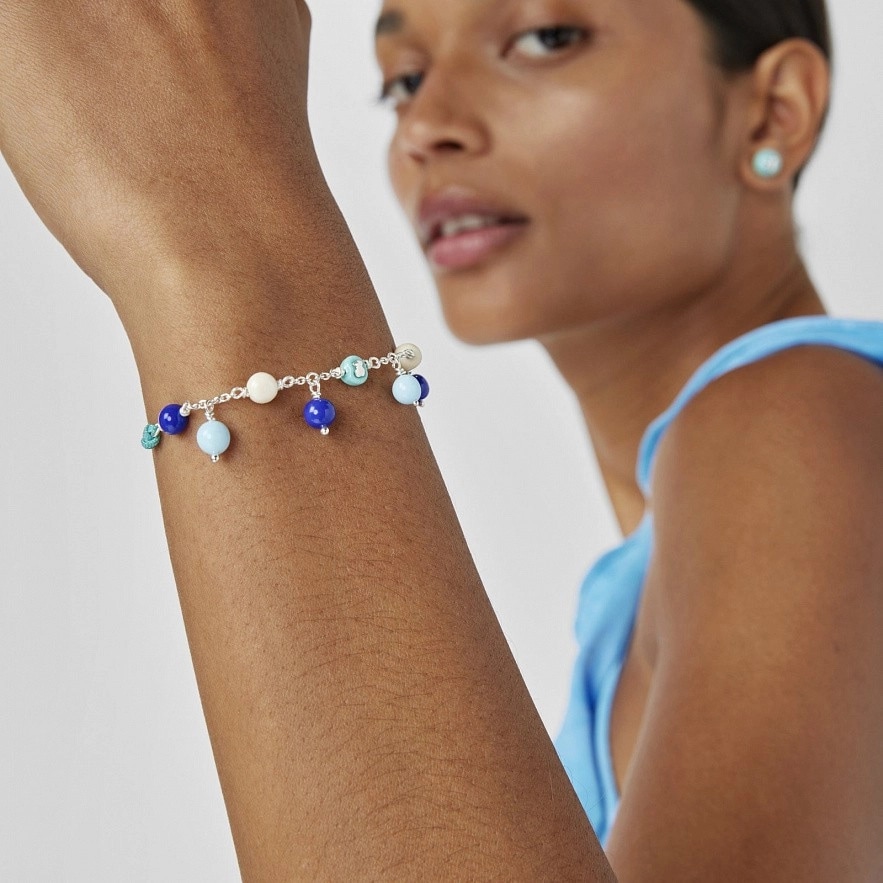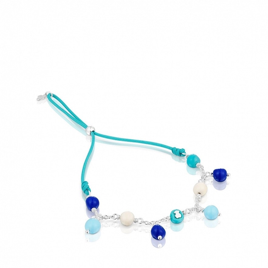 Регулируемый браслет TOUS Icon Glass из серебра 925 пробы и нейлона голубого цвета с шариками из цветного муранского стекла, как фиксированными, так и висящими. Размер шариков: примерно 6 мм. Общая длина: 24,5 см. Застежка-ползунок.
