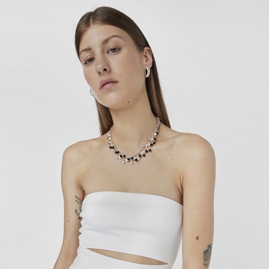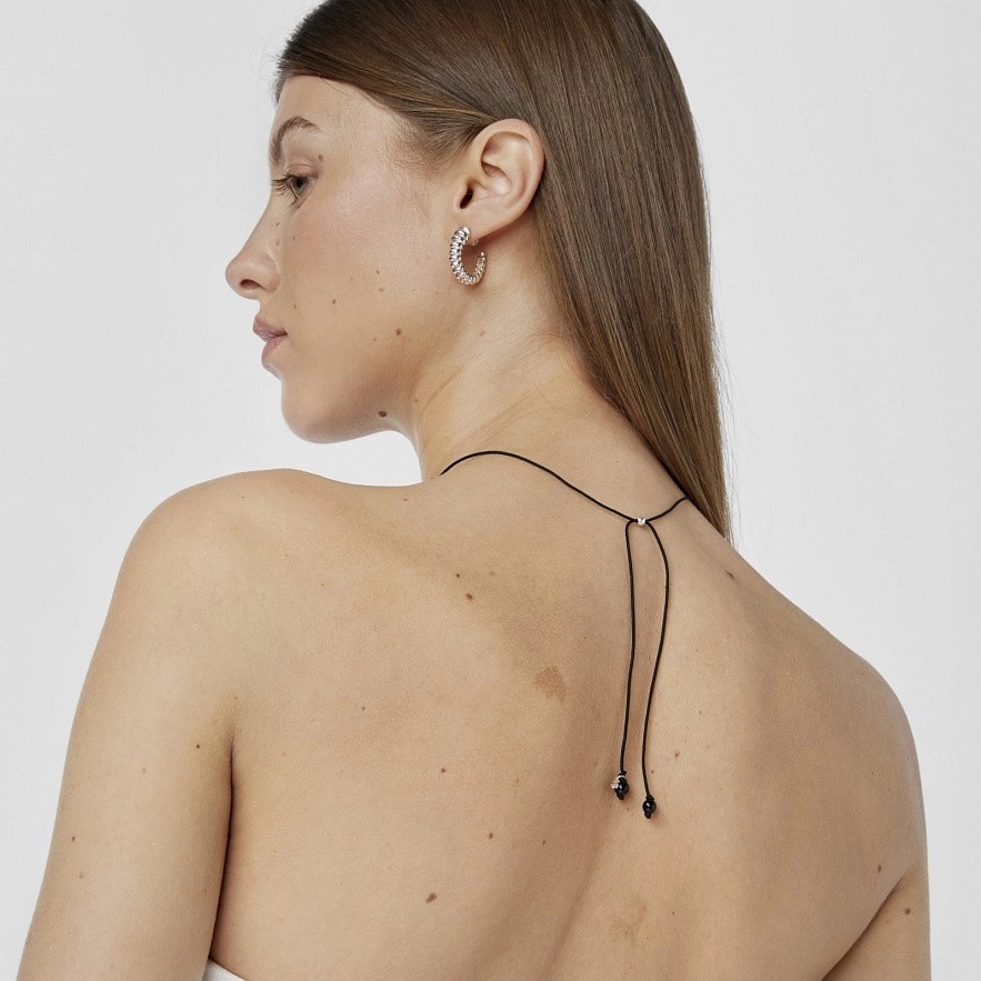 Регулируемое колье TOUS Icon Color из серебра 925 пробы и нейлона черного цвета с ониксовыми шариками, как фиксированными, так и висячими. Размер шариков: примерно 6 мм. Общая длина: 70 см. Застежка-ползунок.