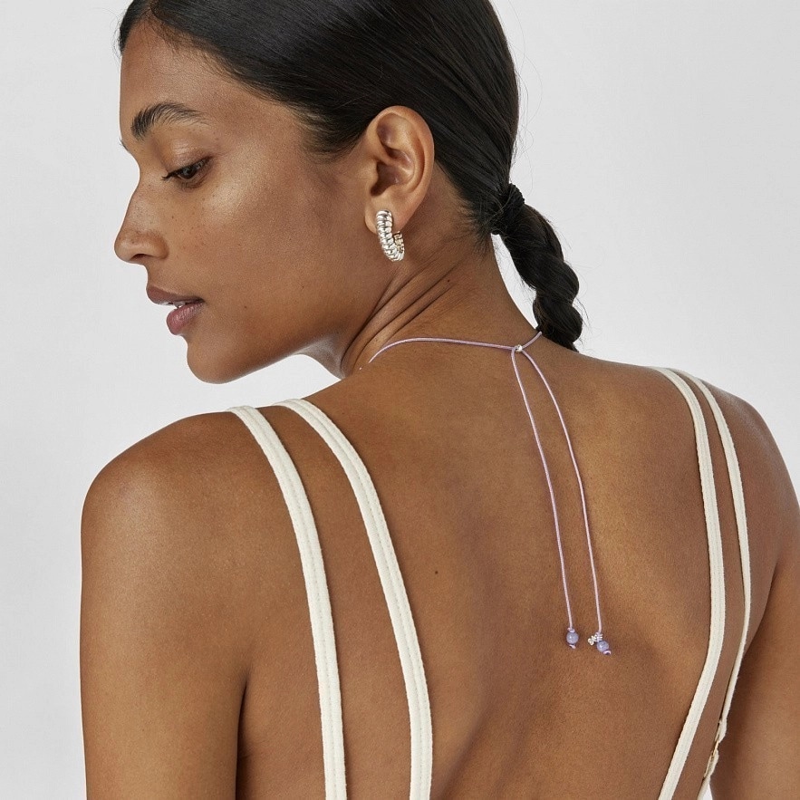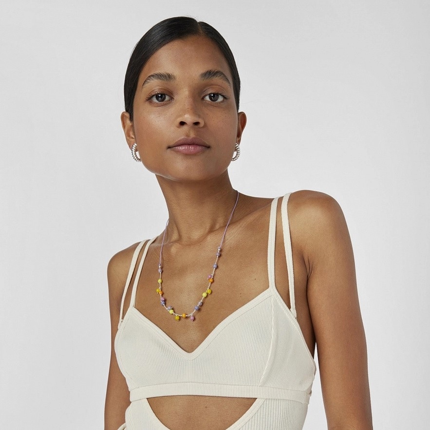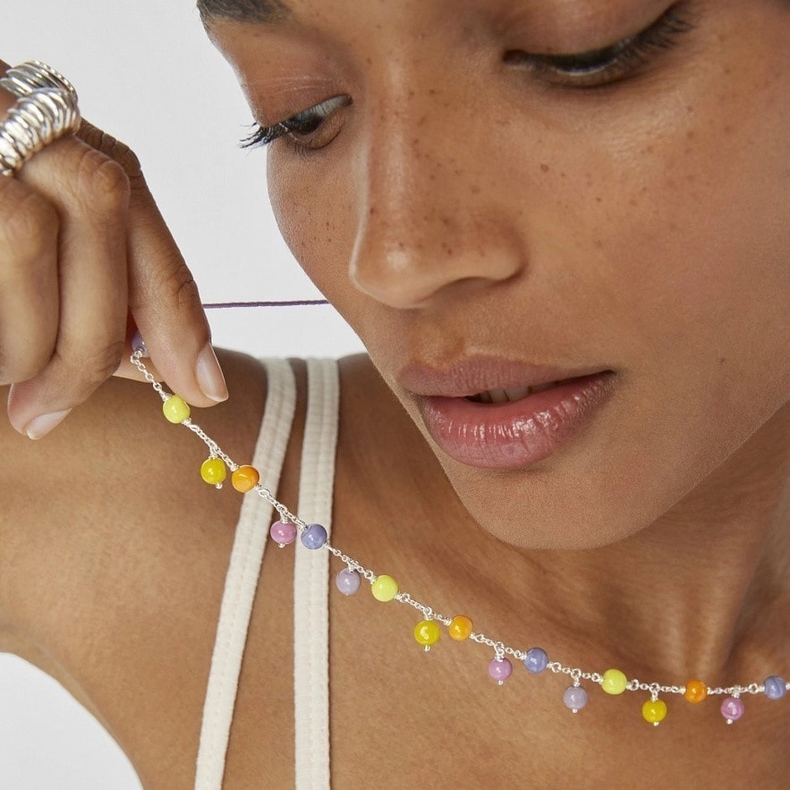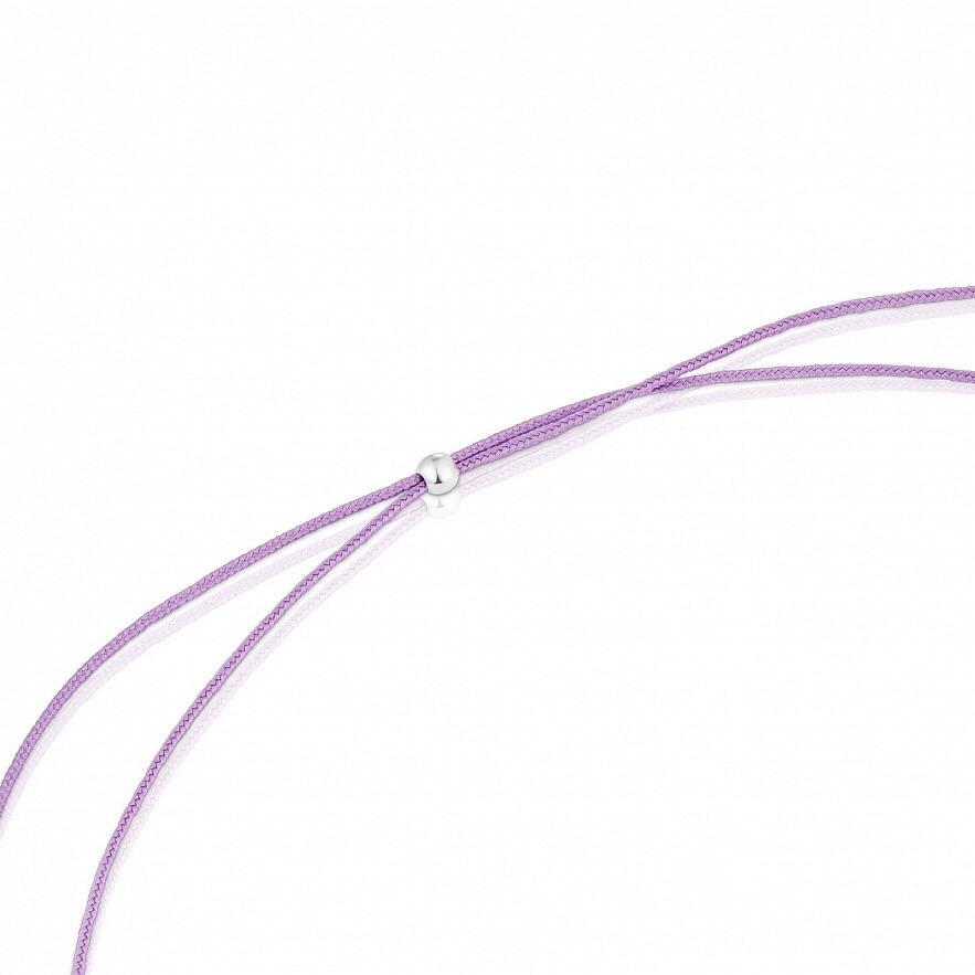 Регулируемое колье TOUS Icon Glass из серебра 925 пробы и нейлона сиреневого цвета с шариками из цветного муранского стекла, как фиксированными, так и висячими. Размер шариков: примерно 6 мм. Общая длина: 70 см. Застежка-ползунок.