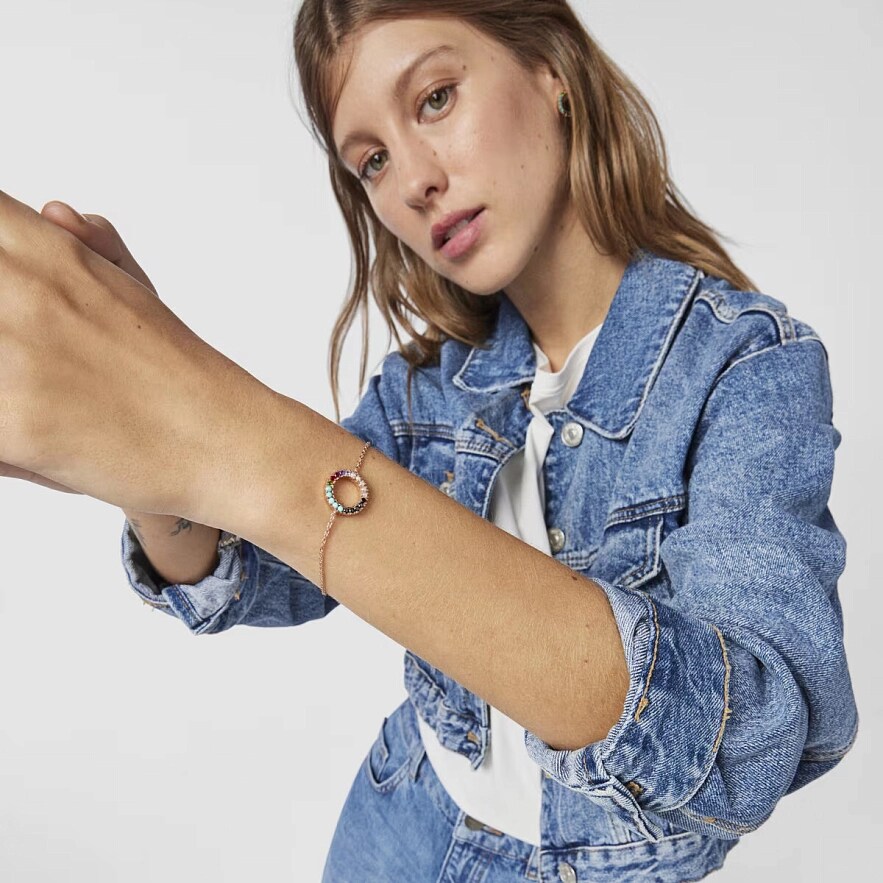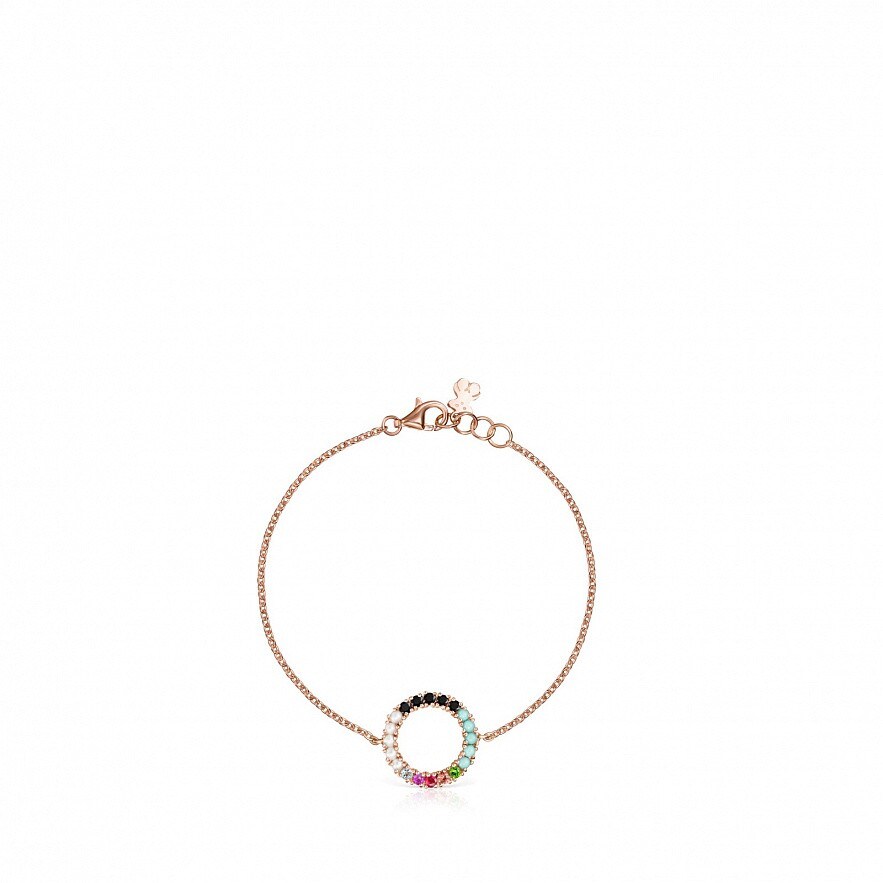 Браслет с диском TOUS Straight из розового Vermeil с бирюзой, шпинелями, жемчугом, голубым топазом, аметистом, рубином, оранжевым сапфиром и цаворитом. Размер диска: 1.6 см. Вермель – слой золота 18 карат минимальной толщины 2,5 микрон на серебре высшей пробы, без каких-либо промежуточных слоев.