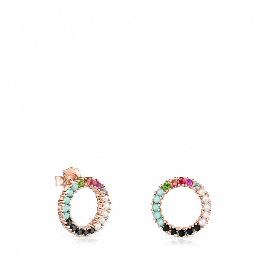 Большие серьги с диском TOUS Straight из розового вермеля со шпинелями, бирюзой, жемчугом, оранжевым сапфиром, рубином, цаворитом, аметистом и синим топазом. С фиксированным штифтом. Размер: 1,6 см. (Vermeil : серебро высшей пробы, покрытое розовым золотом 18 kt).