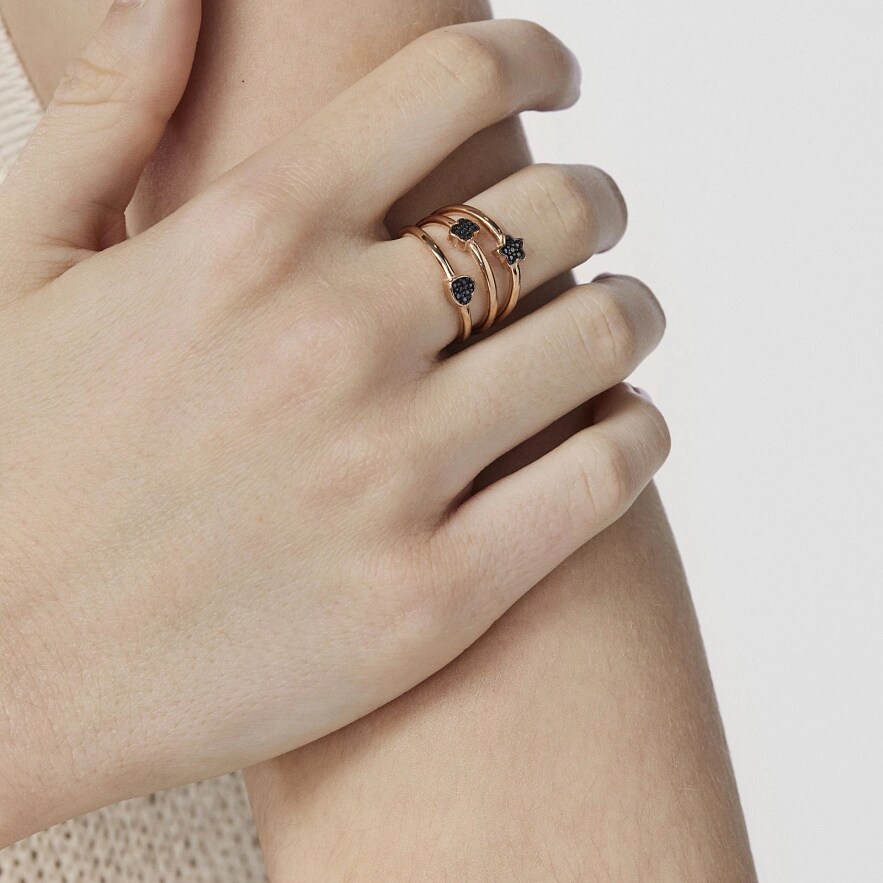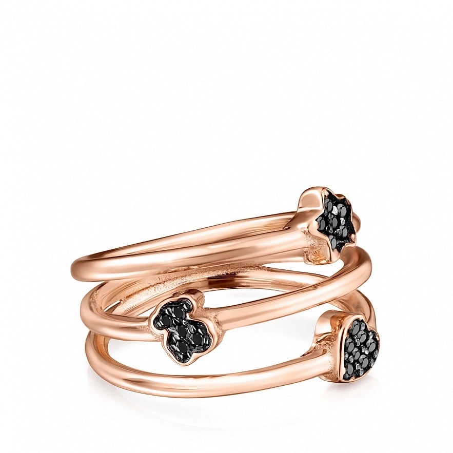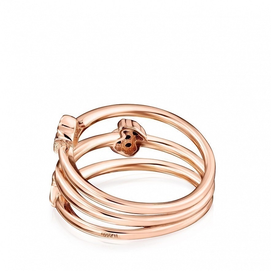 Кольцо TOUS Motif из серебра 925 пробы покрытое 18-каратным розовым золотом, с тремя полосками с различными мотивами шпинели. Ширина: 1,6 см. Размер мотивов: 0,48 см.