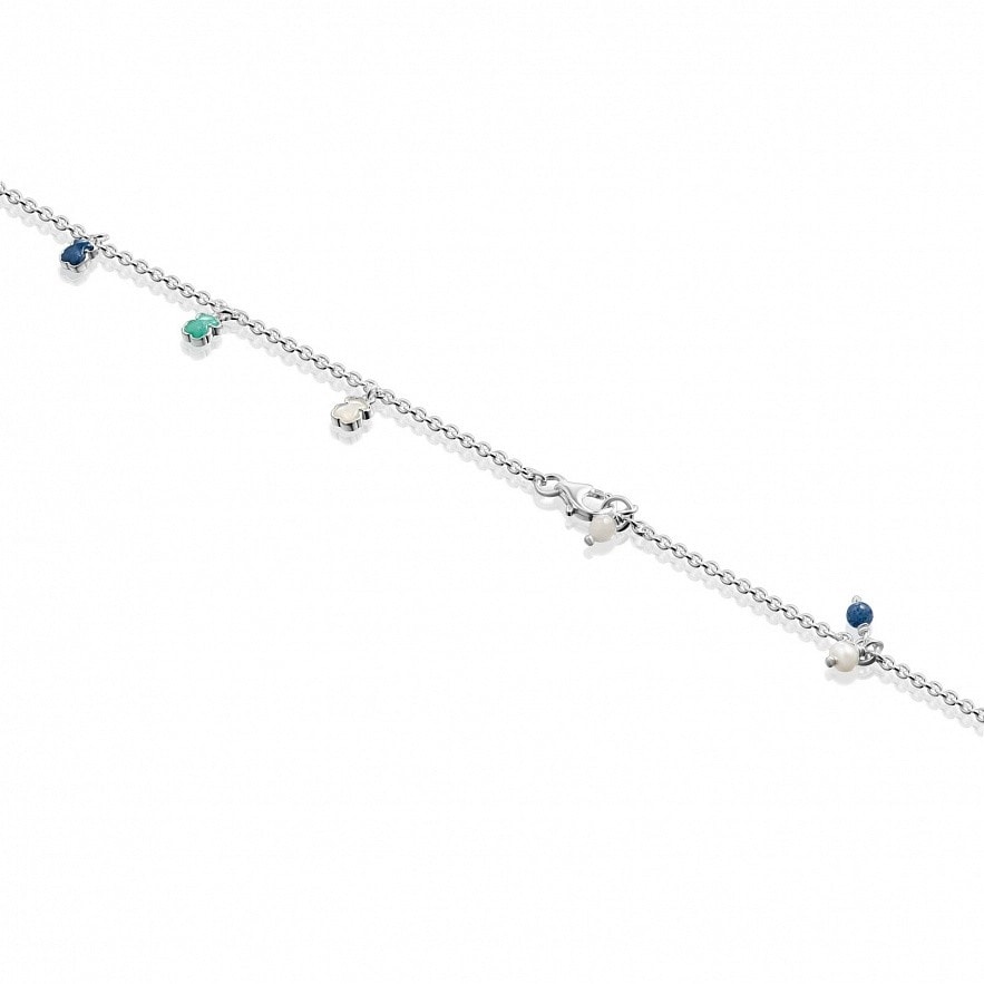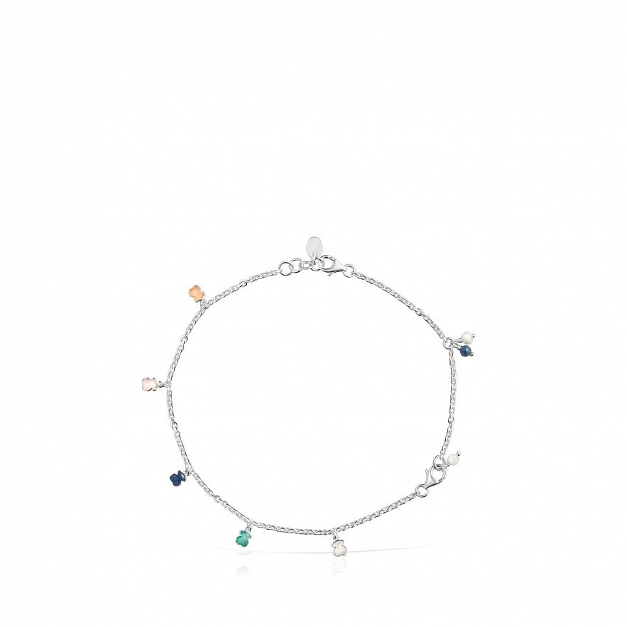 Браслет на руку или ногу TOUS Mini Color из серебра высшей пробы с 5 медвежатами из оранжевого кварцита, розового кварцита, кварца с дюмортьеритом, амазонита, перламутра и жемчуга. Удлинитель 8,5 см для ношения на ноге. Длина: 17,5–26 см.