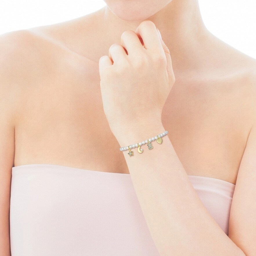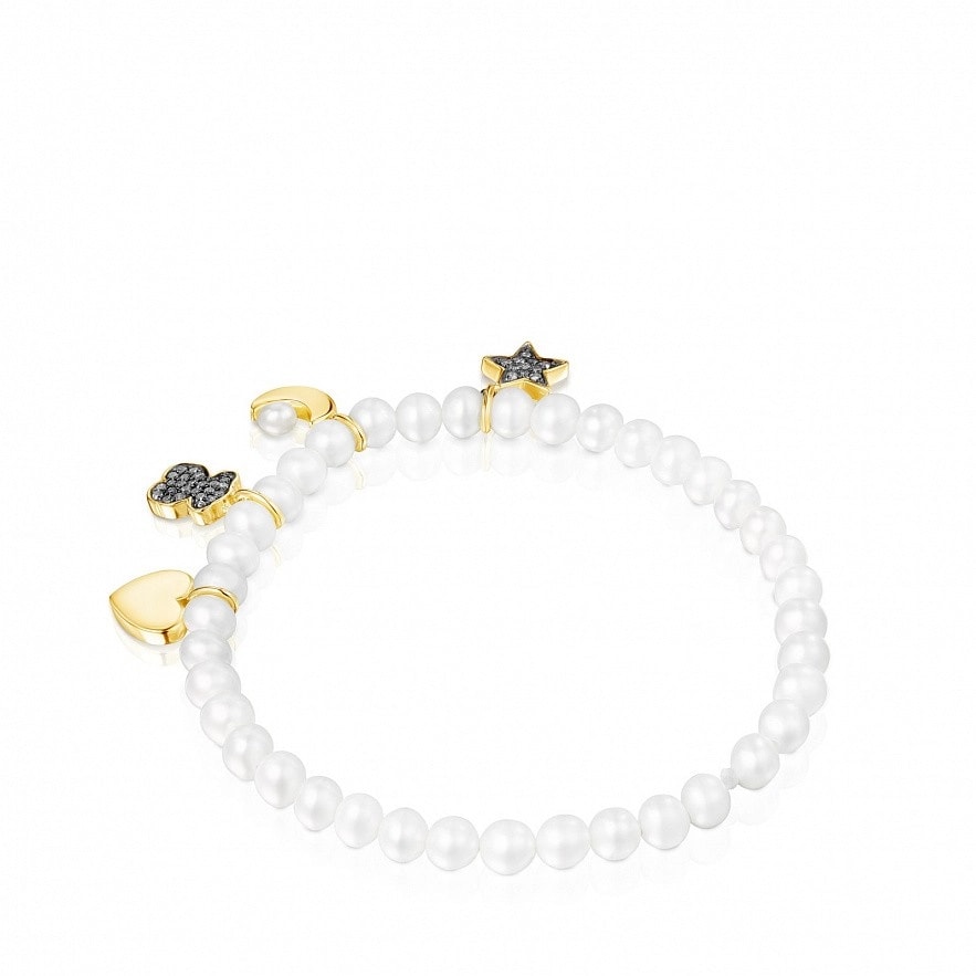 Браслет TOUS Nocturne из жемчуга Ø3-3,5 мм с 4 подвесными фигурками из серебра 925 пробы с покрытием Vermeil с бриллиантами 0,18 карат огранки «восьмерка». Размер фигурок: 0,8 см. Vermeil : серебро, покрытое слоем желтого золота 18kt.