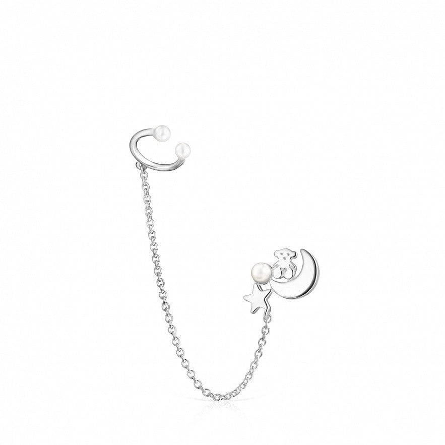 Полусерьга TOUS Nocturne из серебра высшей пробы с жемчугом Ø4-4,5 мм, луной, медвежонком и звездой. Длина цепочки: 10 см. Каффа: Ø1,5 мм.
