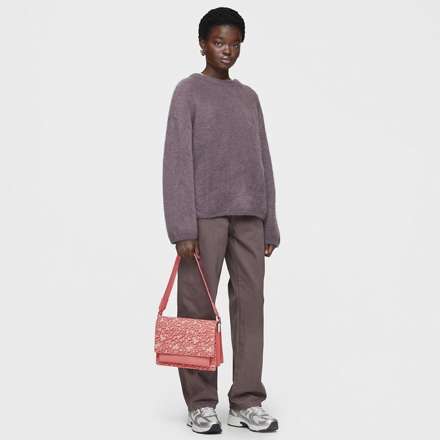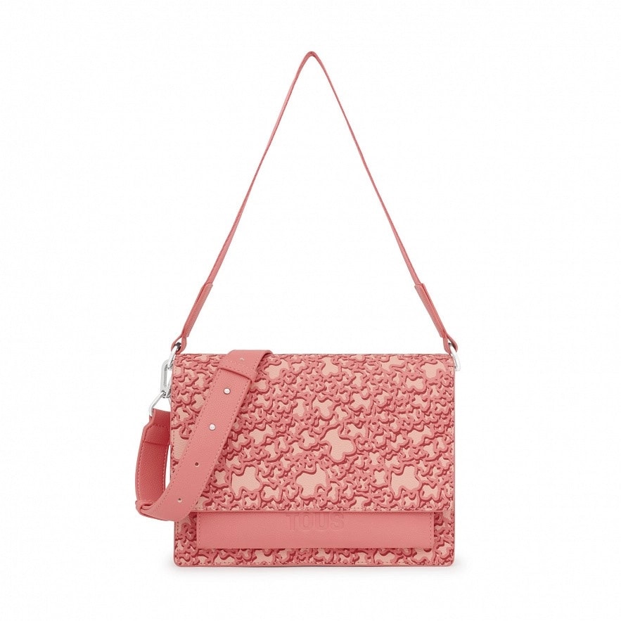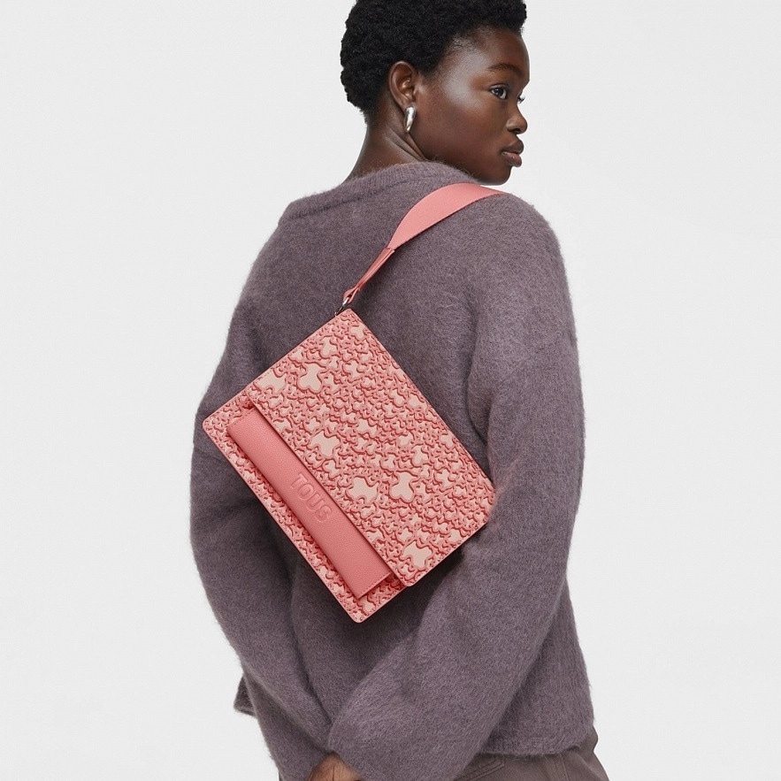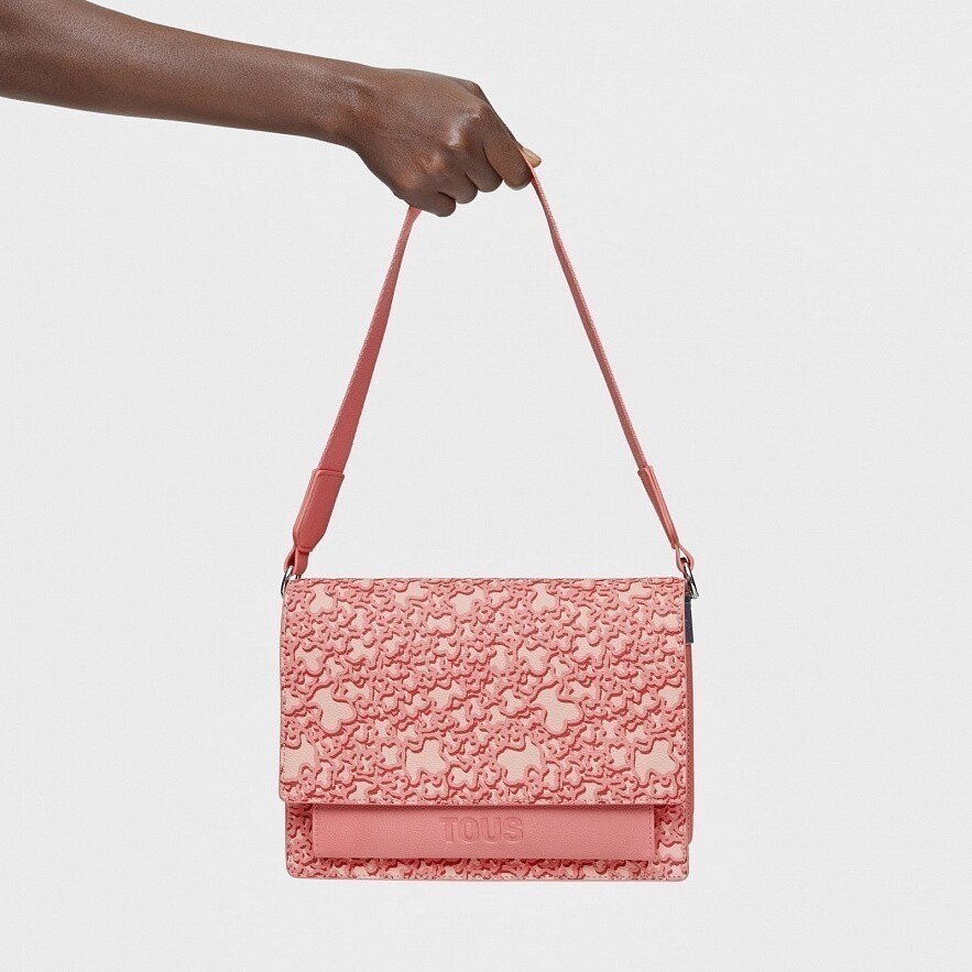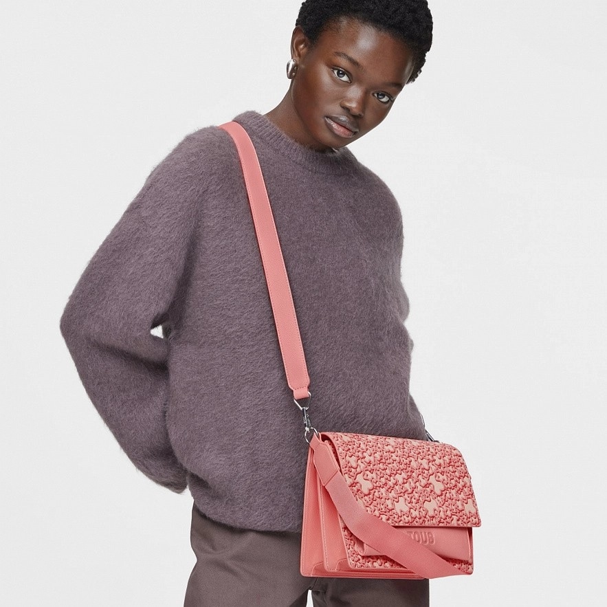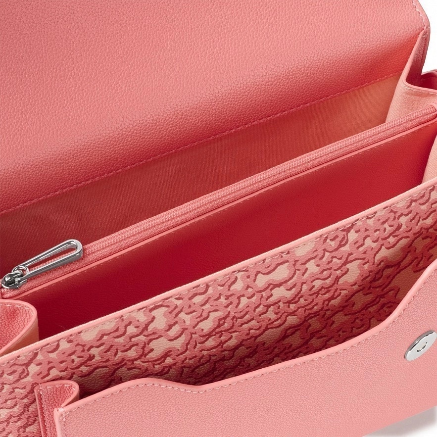 Сумка TOUS Kaos Mini Evolution Audree середнього розміру з оздобленням із штучної шкіри коралового кольору та принтом Kaos. Дві магнітні кнопки. Відкрита зовнішня кишеня. В середині два відділення, розділених кишенею на блискавці. Фіксований плечовий ремінь і зйомний регульований ремінь через плече. Розміри (висота х ширина х глибина): 20 х 25 х 12 см.