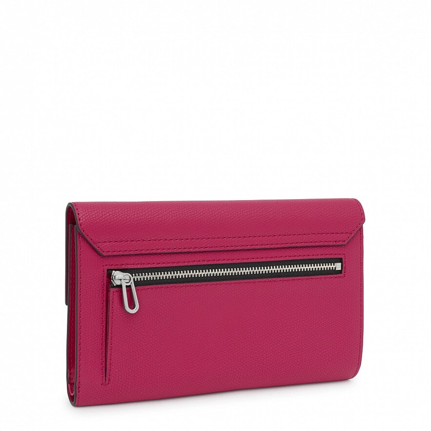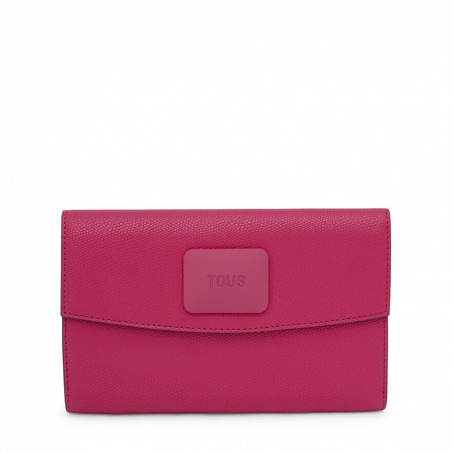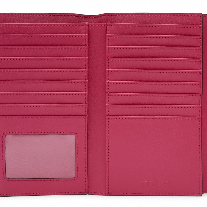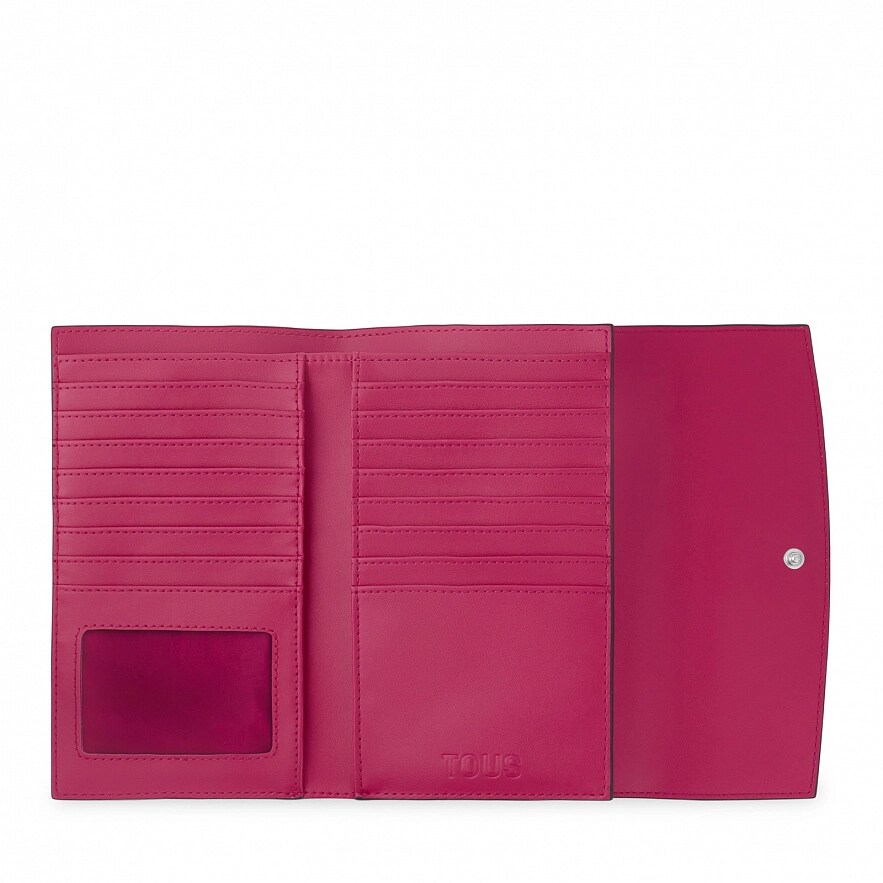 Великий гаманець на клапані TOUS Lucia з поліуретану кольору фуксії. Застібка на клапані та кнопці. Кишеня на блискавці для монет. Всередині три відкритих відділення для банкнот і шістнадцять слотів для карток. Розміри (висота х ширина х глибина): 11 х 19,50 х 2 см.