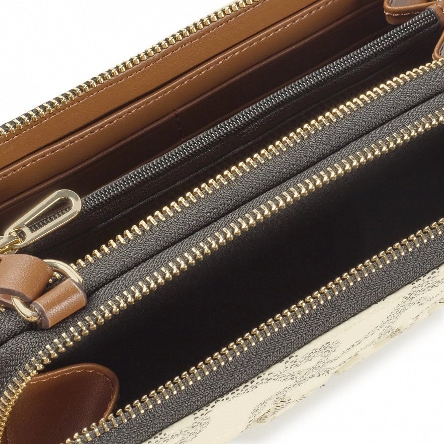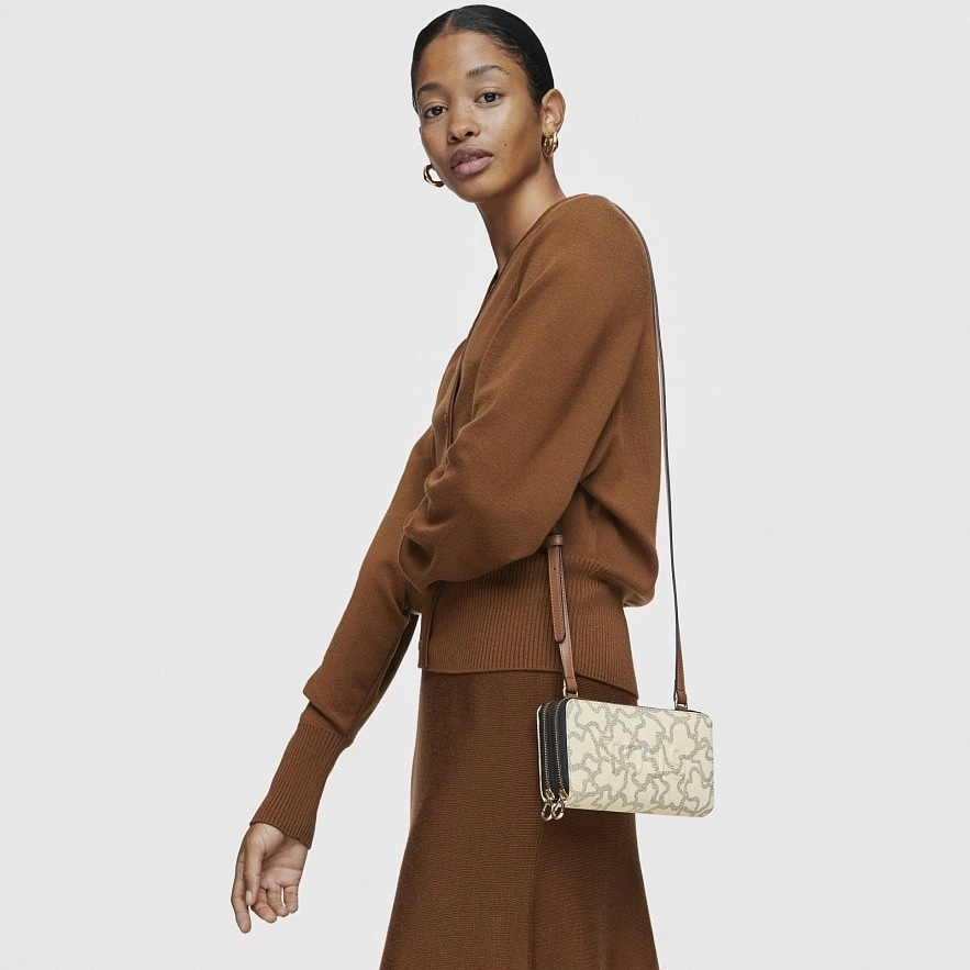 Гаманець TOUS Kaos Icon бежевого кольору з оздобленням зі штучної шкіри. Має два основних відділення, які закриваються на блискавку. Одне з них достатньо велике, щоб помістити ваш мобільний телефон. Інше має вісім слотів для карток, місце для монет і два для купюр. Регульований ремінь через плече. Розміри (висота х ширина х глибина): 10 х 19,5 х 4 см.