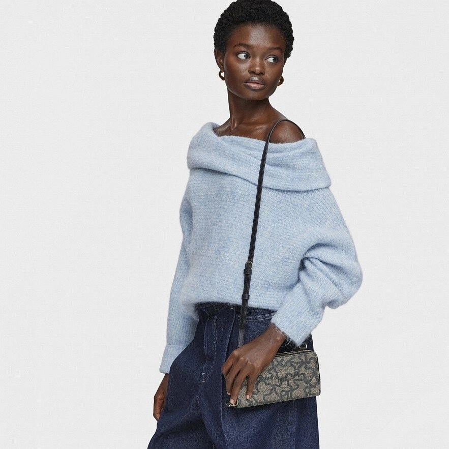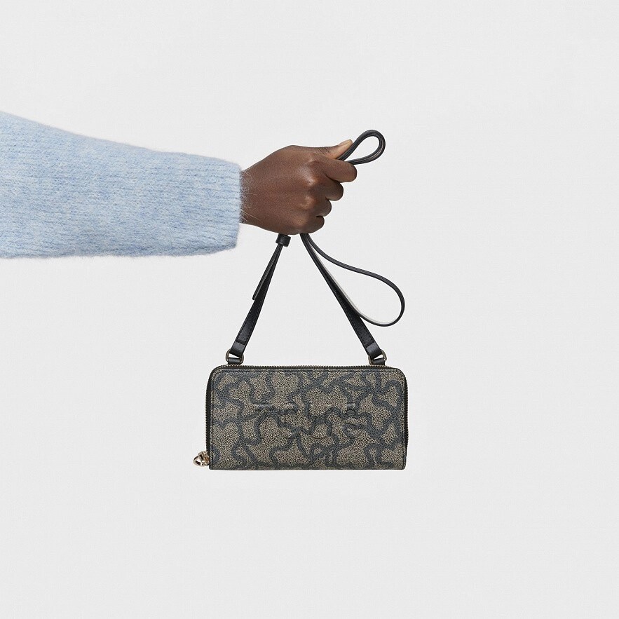 Гаманець TOUS Kaos Icon чорного кольору з оздобленням зі штучної шкіри. Має два основних відділення, які закриваються на блискавку. Одне з них достатньо велике, щоб помістити ваш мобільний телефон. Інше має вісім слотів для карток, місце для монет і два для купюр. Регульований ремінь через плече. Розміри (висота х ширина х глибина): 10 х 19,5 х 4 см.