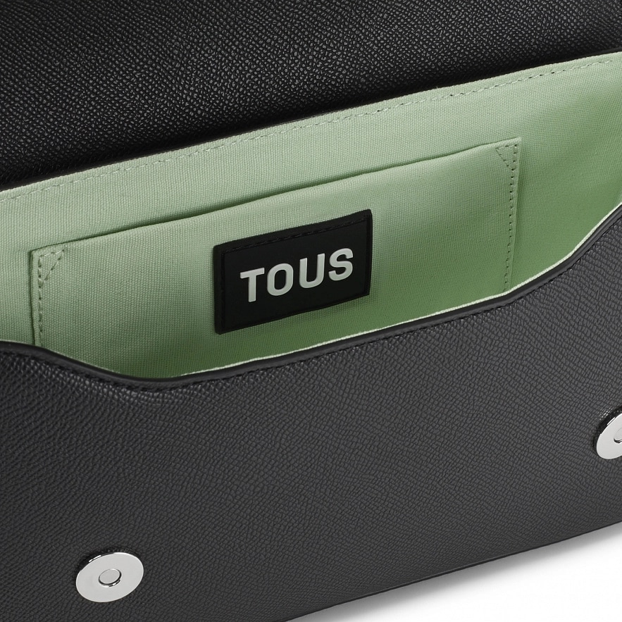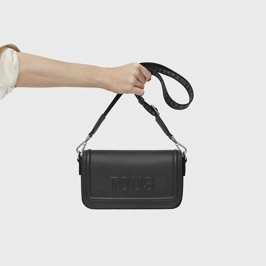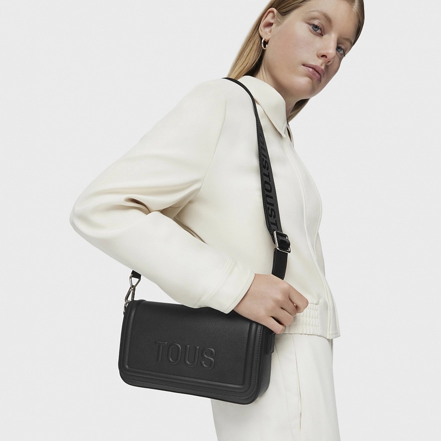 Сумка середнього розміру TOUS La Rue New з чорної штучної шкіри. Клапан на магнітній кнопці для застібки. Відкрита внутрішня кишеня. Регульований і знімний ремінь через плече. Розміри (висота х ширина х глибина): 13 х 26 х 7 см.