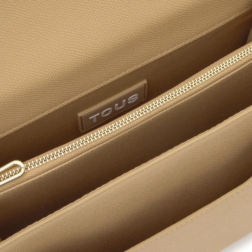Сумка TOUS Brenda Audree з поліуретану пісочного кольору. Має клапан і застібку на дві магнітні кнопки. Має два відділення, розділені одним на блискавці, та відкриту кишеню спереду. Фіксований плечовий ремінь і регульований, знімний ремінь через плече. Розміри (висота х ширина х глибина): 19 x 25 x 11,5 см