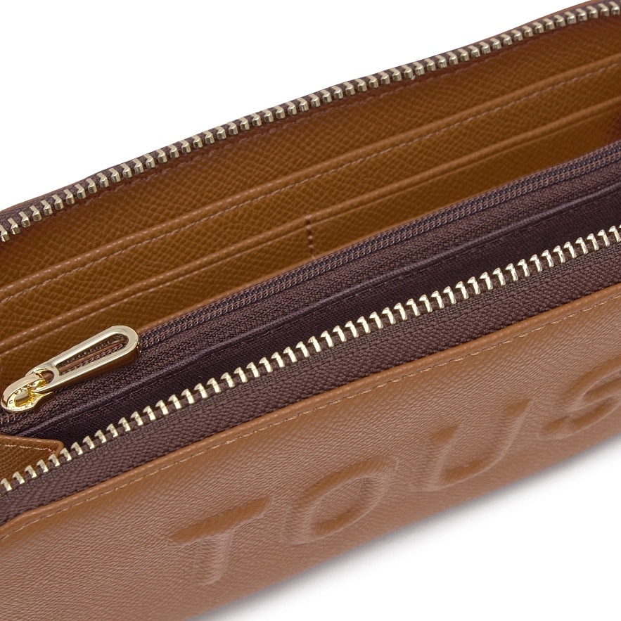 Гаманець TOUS Brenda з поліуретану кольору кемел. Закривається на блискавку. Всередині два відкритих відділення для банкнот, відділення на блискавці для монет і вісім слотів для карток. Розміри (висота х ширина х глибина): 11 х 19,5 х 2,5 см.