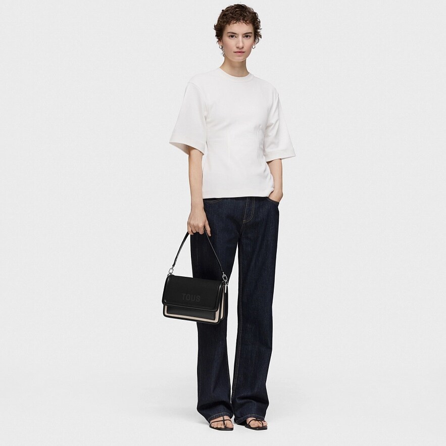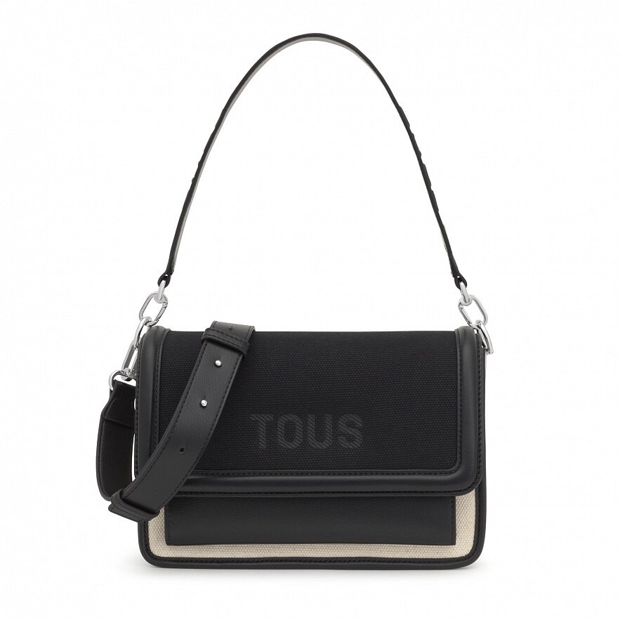 Сумка TOUS Audree середнього розміру з органічноі бавовни та поліуретану, з деталями з чорної волов'ячої шкіри. Застібка на магнітних кнопках. Два відділення, розділені ще однією кишенею на блискавці. Відкрита кишеня спереду і відкрита кишеня ззаду. Знімний плечовий ремінь, регульований і знімний ремінь через плече. Розміри (висота х ширина х глибина): 18 х 25 х 11 см.