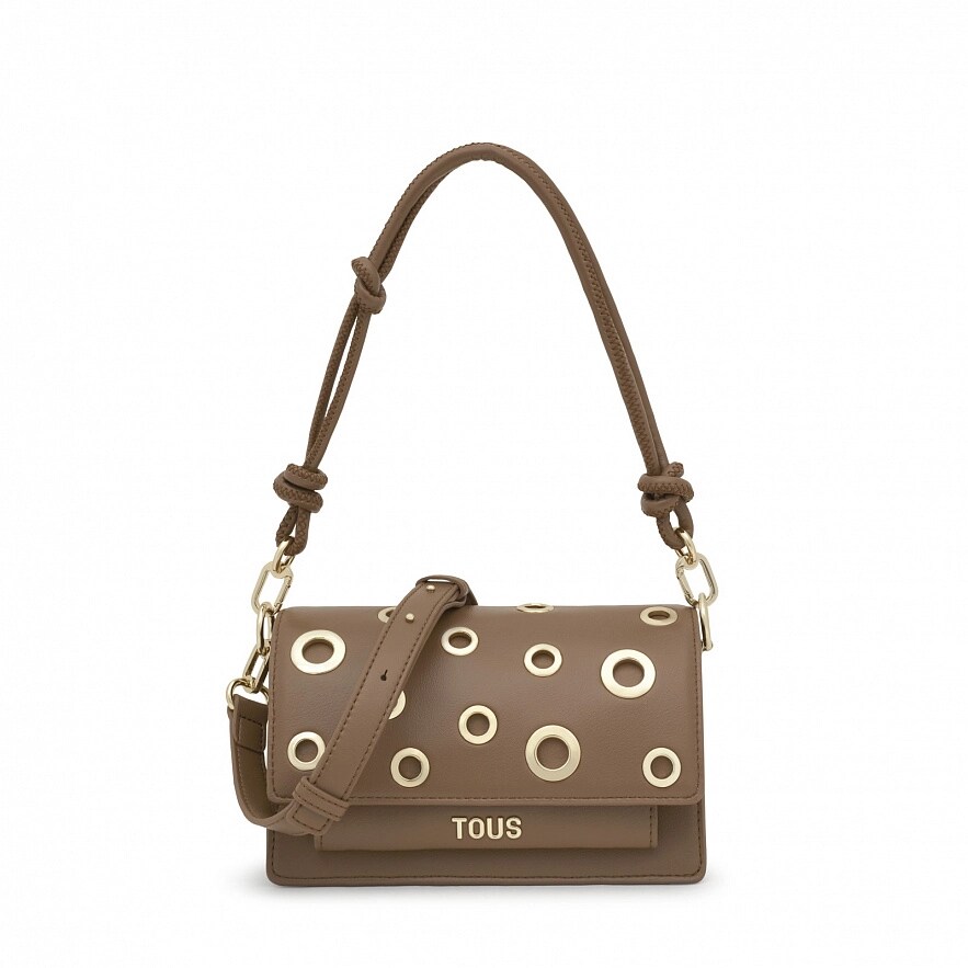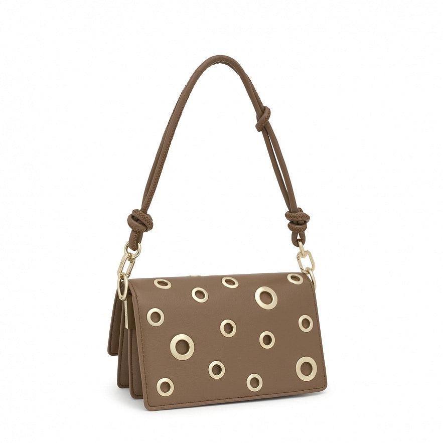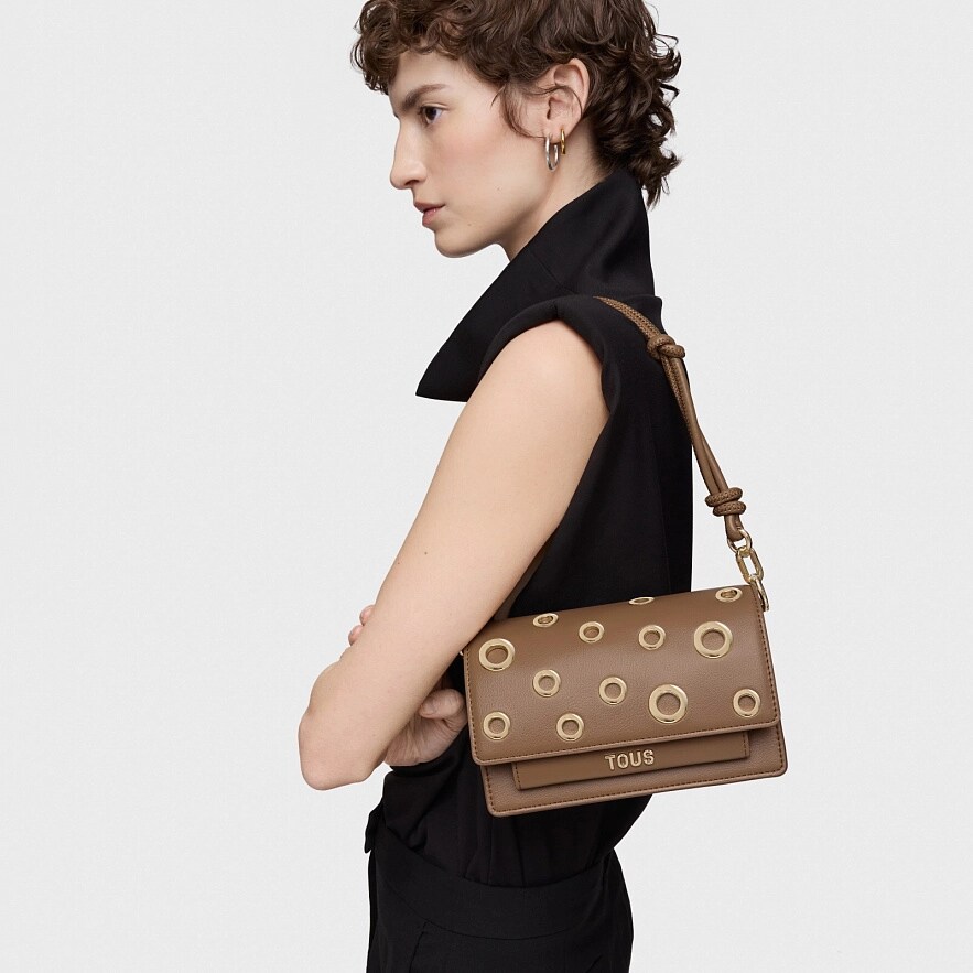 Сумка Audree Eyelets з коричневий поліуретану, середнього розміру. Застібка на магнітних кнопках. Відкрита кишеня спереду і два відкритих відділення всередині. Знімний плечовий ремінь, регульований і знімний ремінь через плече. Розміри (висота х ширина х глибина): 12 х 20 х 10,5 см.