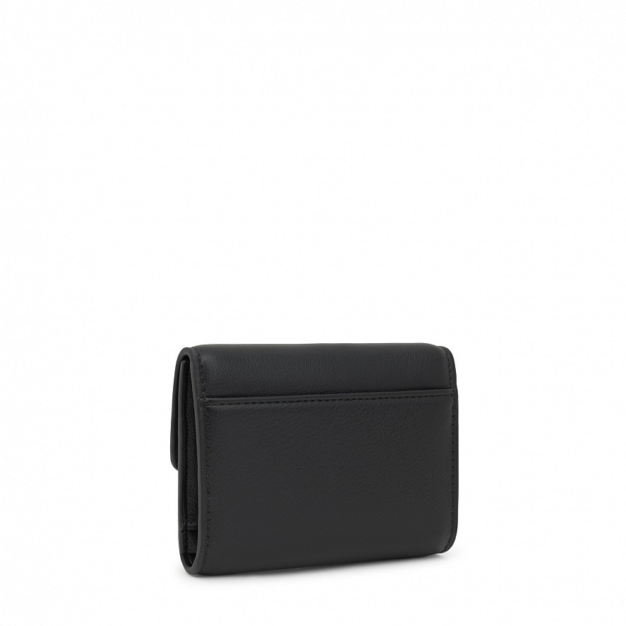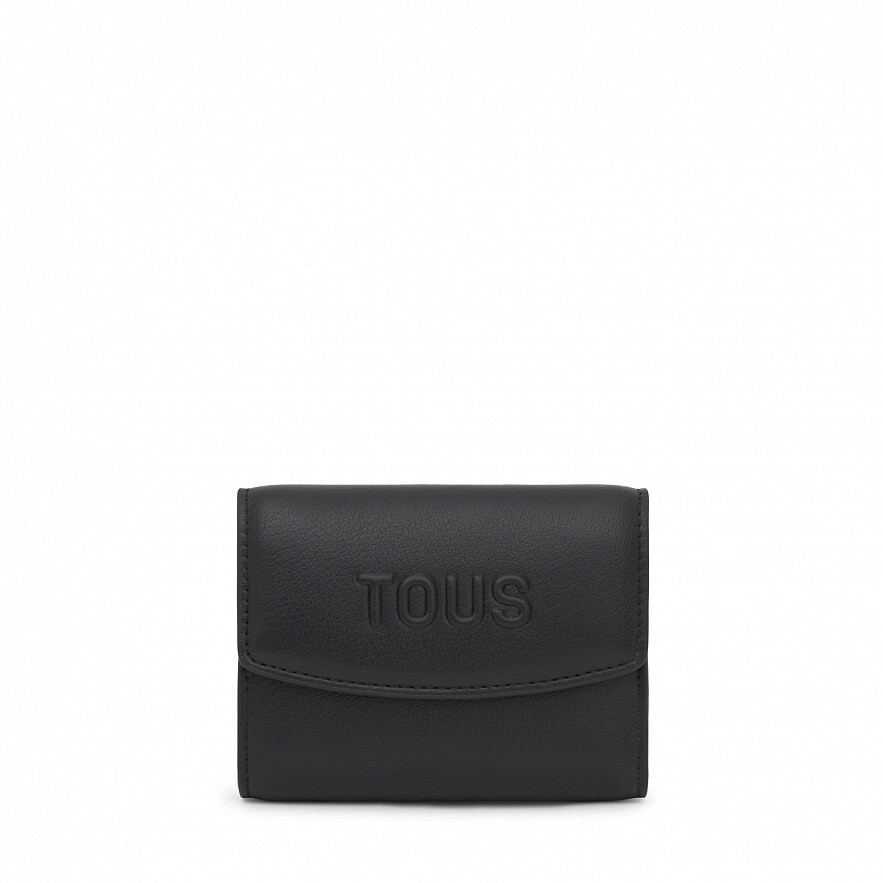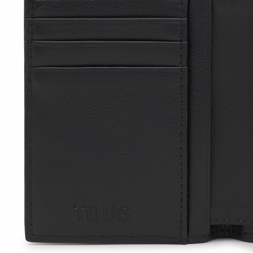 Гаманець TOUS Bloom Pocket з поліуретану чорного кольору. Закривається на клапан з кнопкою. Всередині п'ять відділень для карток, одне відділення для купюр і кишенька на кнопці для монет. Розміри (висота х ширина х глибина): 10 х 12 х 2 см.