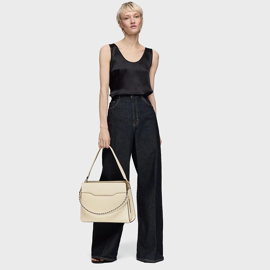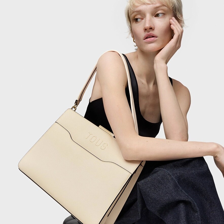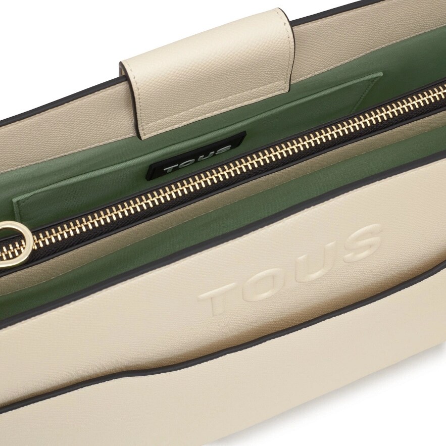 Сумка TOUS Audree Saffiano з поліуретану бежевого кольору. Магнітна застібка. Два відділення, розділені одним на блискавці. Внутрішня кишеня та зовнішня кишеня відкриваються. Два знімних плечових ременя. Розміри (висота х ширина х глибина): 25 х 33,5 х 12,5 см.