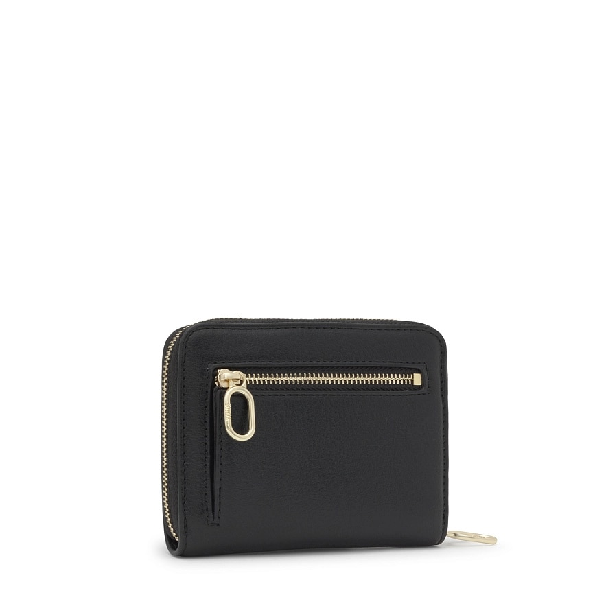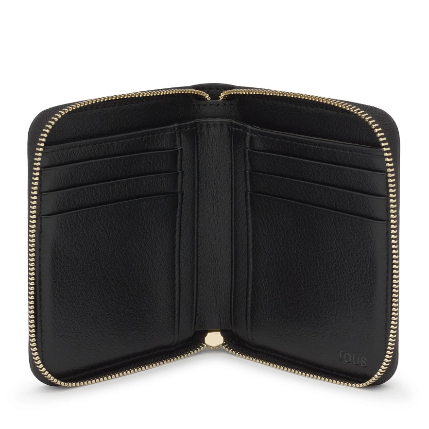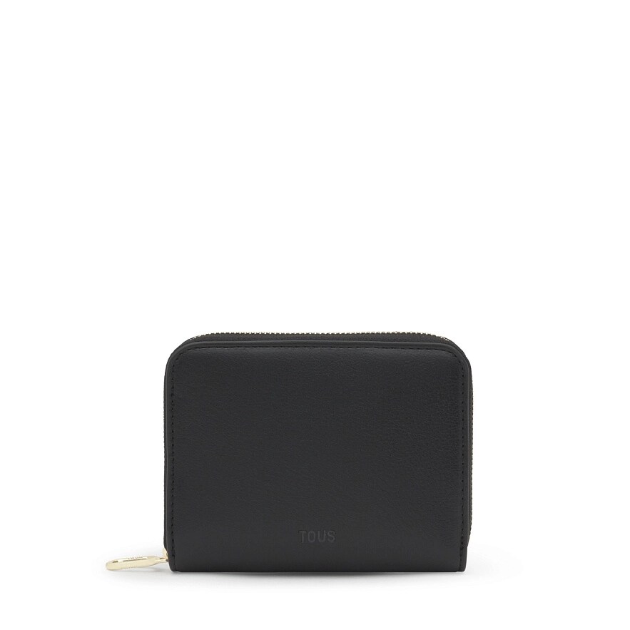 Гаманець TOUS City з чорного поліуретану. Застібка-блискавка. Всередині є шість слотів для карток, відділення для банкнот і відділення на блискавці для монет. Розміри (висота x ширина x глибина): 12,5 x 10 x 2 см.