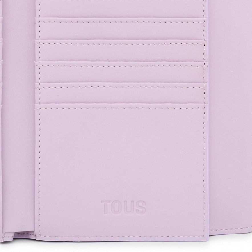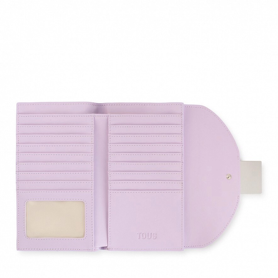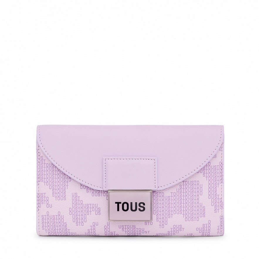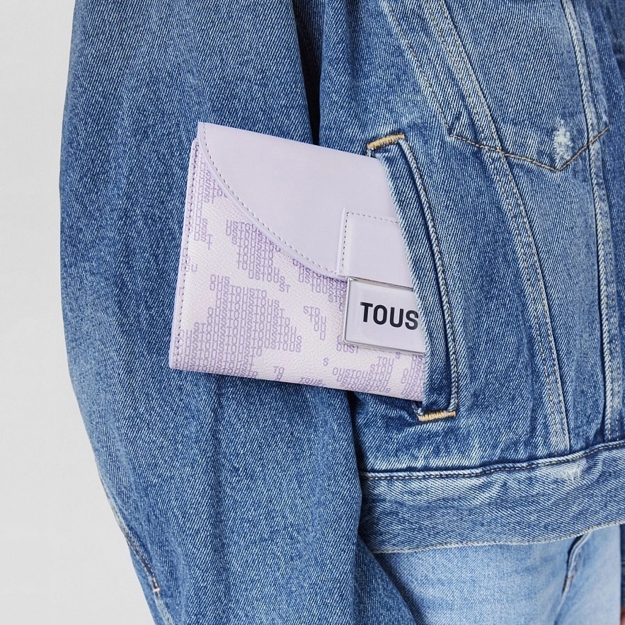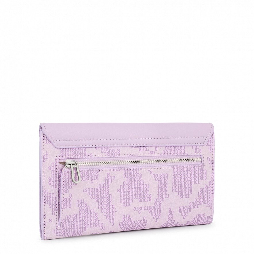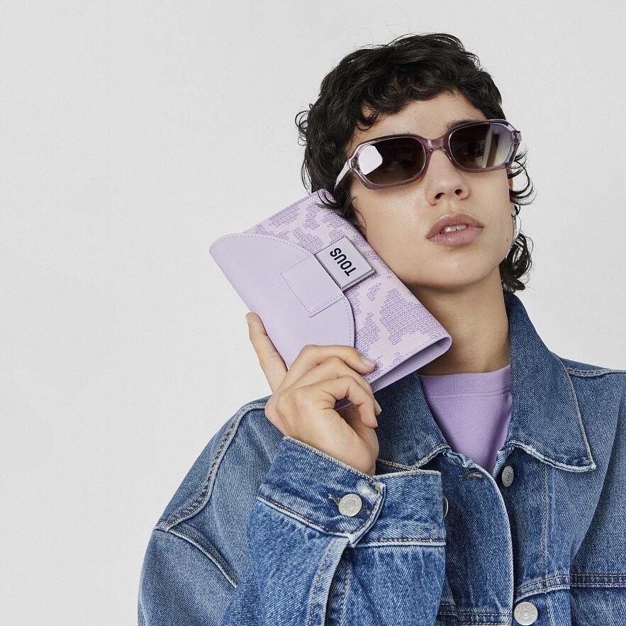 Гаманець TOUS Kaos Pix Flap з принтом лілового кольору. Має оздоблення з штучної шкіри. Застібка на клапан із кнопкою та задня кишеня на блискавці для монет. Всередині має три відкритих відділення для банкнот і 16 слотів для карток. Розміри (висота х ширина х глибина): 11 х 19 х 3 см.