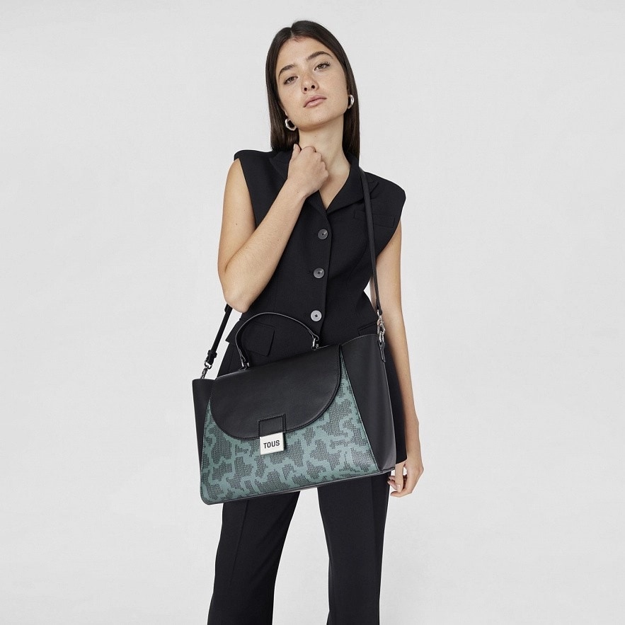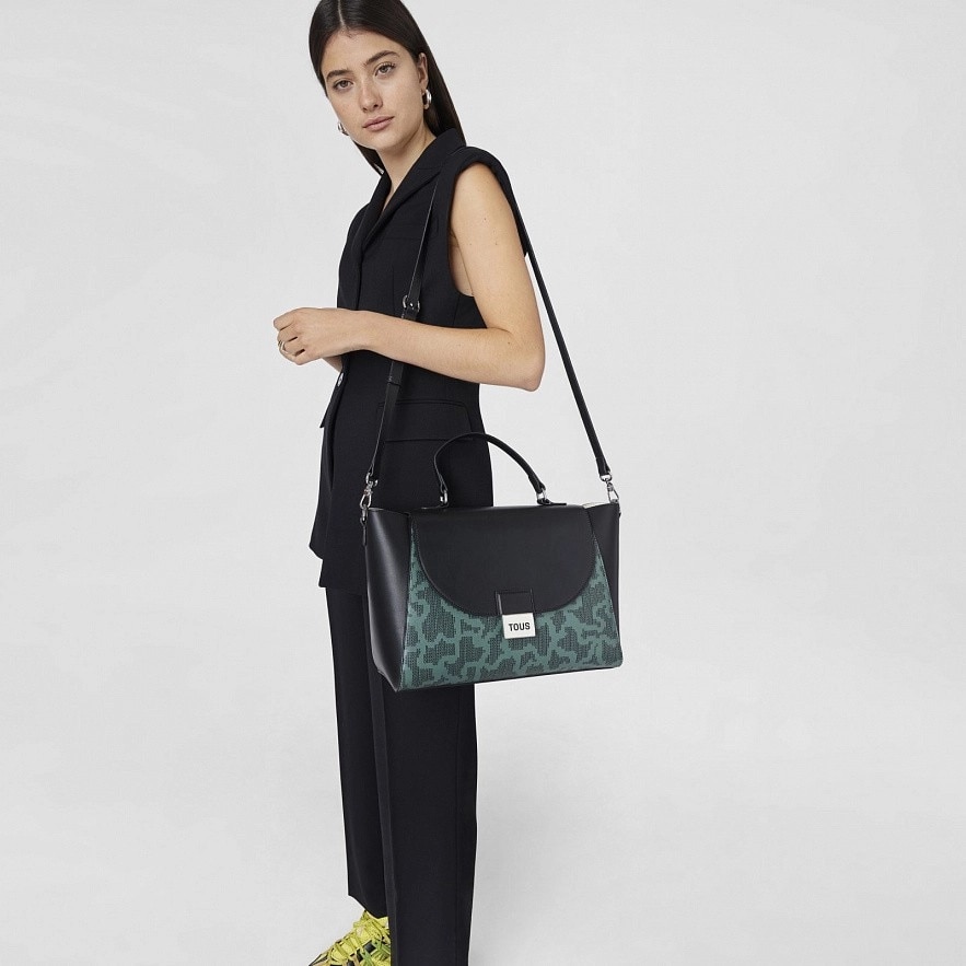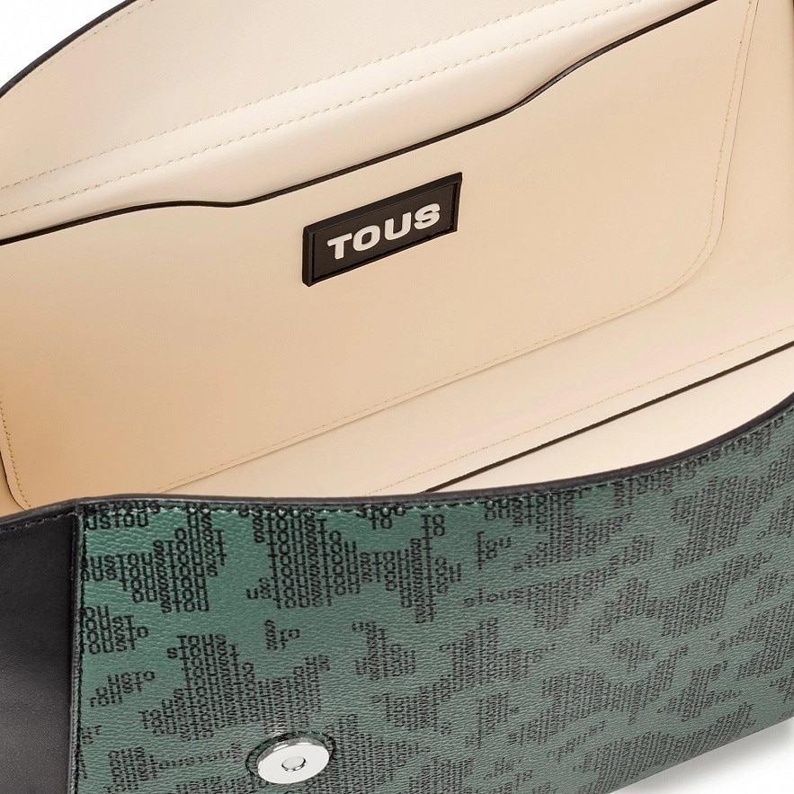 Велика міська сумка TOUS Kaos Pix з зелено-чорним принтом. Оздоблена штучною шкірою. Закривається на дві магнітні кнопки. Відкрита внутрішня кишеня. Фіксована ручка та регульований і з`ємний ремінь через плече. Розміри (висота х ширина х глибина): 24 x 39 x 15 см.