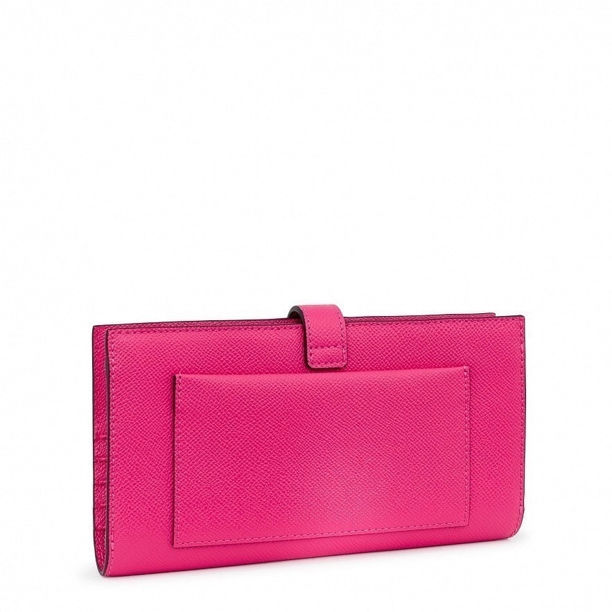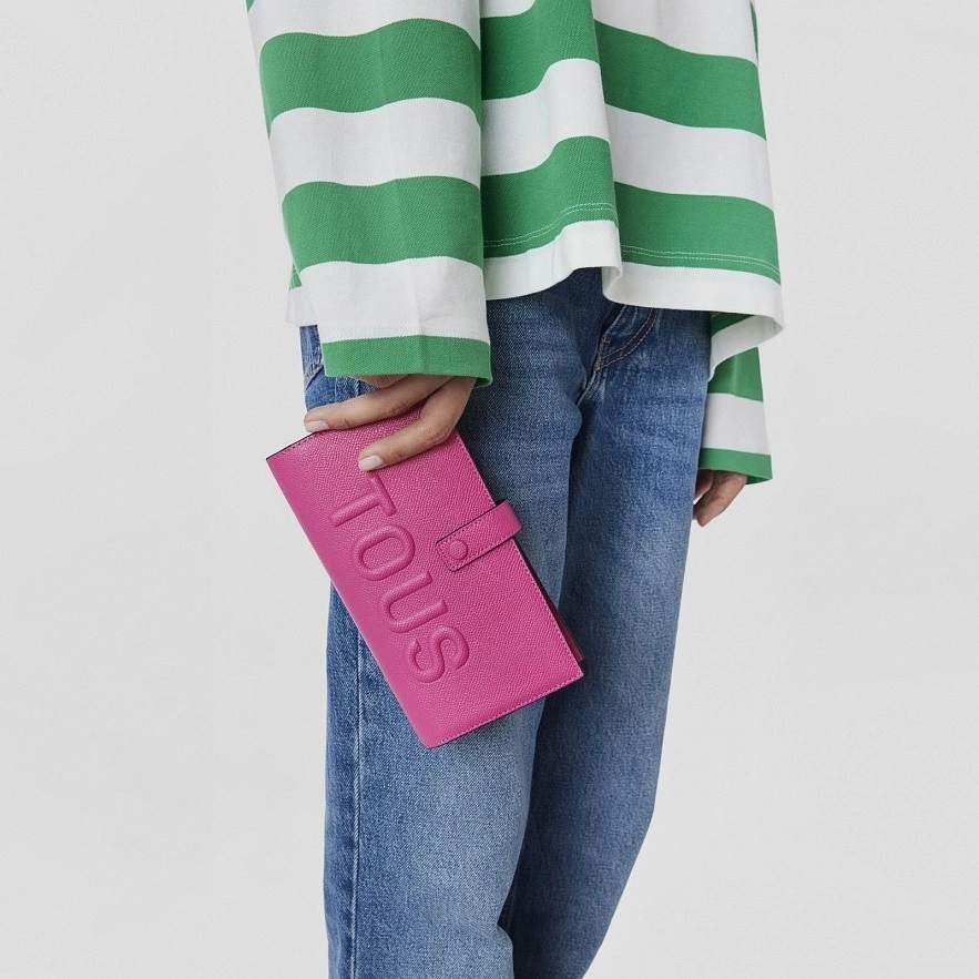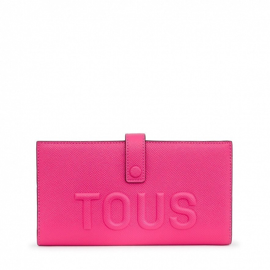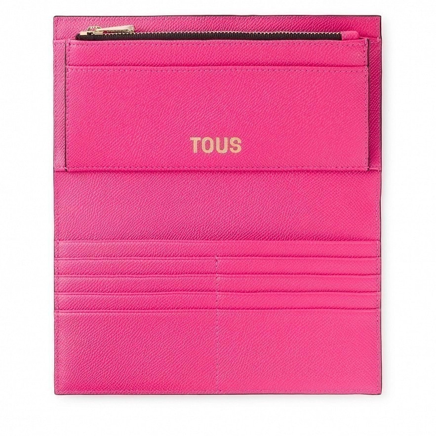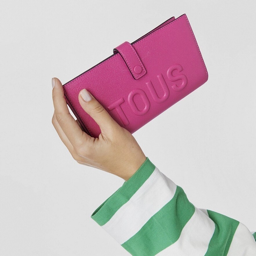 Кишеньковий гаманець TOUS La Rue із штучної шкіри кольору фуксії. Застібка на кнопки та відкрита задня кишеня. Всередині чотири відкритих відділення для банкнот, одна кишеня на блискавці для монет і вісім відділень для карток. Розміри (висота х ширина х глибина): 11 х 19,5 х 3 см.