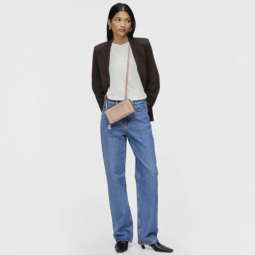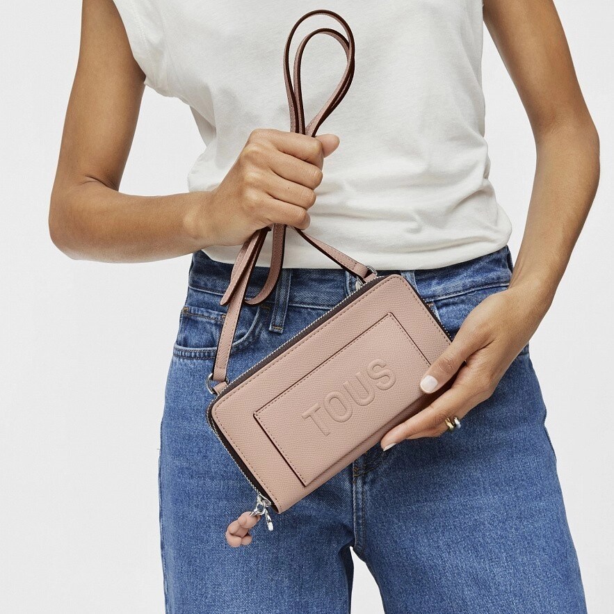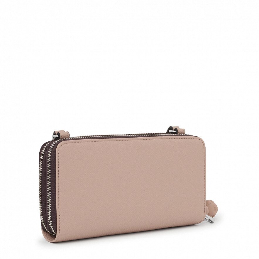 Гаманець TOUS La Rue New зі штучної шкіри пудрового кольору. Має два основних відділення, які закриваються на блискавку. Одне відділення достатньо велике, може вмістити мобільний телефон. Інше - має вісім слотів для карток, місце для монет і для купюр. Регульований ремінь через плече. Розміри (висота х ширина х глибина): 10 х 19,5 х 4 см.