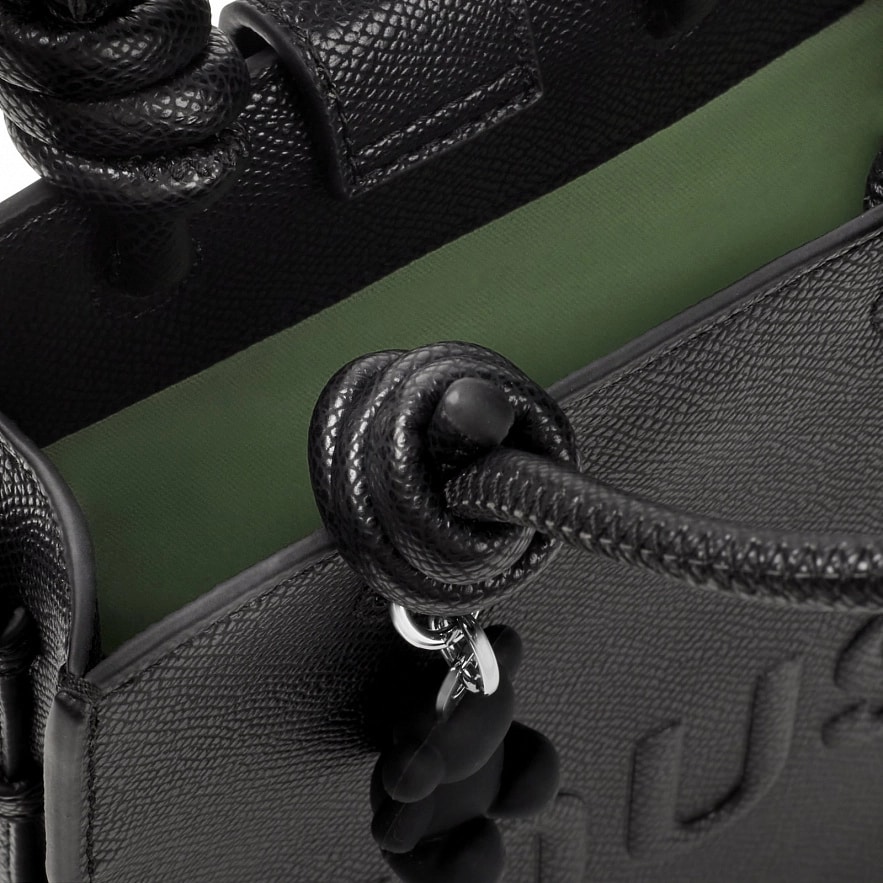 Міні-сумка TOUS La Rue New Pop зі штучної шкіри чорного кольору. Застібка на магнітній кнопці. Фіксовані ручки та регульований і знімний ремінь через плече. Має симпатичну підвіску у вигляді ведмедика. Розміри (висота х ширина х глибина): 20,5 x 16 x 6 см.
