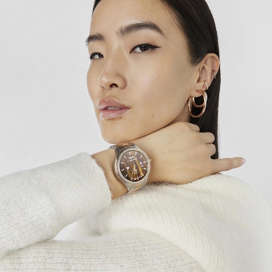 Безель з фіанітами. Сумісність: Android 7.0 та iOS 12.0 або вище. 1.09-дюймовий сенсорний екран (Full Touch). Операційна система: РТ ОС. Можливості з'єднання: Bluetooth версії BT 5.0. Оперативна пам'ять: SRAM M4, 128 Мб Flash ROM Батарея: 180 мАг, 3,7 В літієва перезаряджається з магнітним кабелем, 5 днів роботи і 10 днів у стані спокою. Чіпсет/процесор: Realtek RTL8762C-VD – ARM Cortex-M0 – частота 53 МГц. Водонепроникний: IP68. Функції: 12 сфер TOUS і одна сфера можуть бути взаємозамінні в додатку TOUS WEAR, години, хвилини, секунди, місяць, день, день тижня, щоденна активність з лічильником кроків, лічильник калорій, пройдена відстань в милях або кілометрах, спорт ( ходьба, біг , скелелазіння, їзда на велосипеді, бігова доріжка, хайіт, йога, фітнес, теніс і скакалка), Вібробудильник, пульс, моніторинг сну, погода, хронограф 1/100 секунди, 3 ігри та повідомлення (дзвінки, WhatsApp, електронна пошта, і т. д.), керування музикою, фотоконтроль, релаксація. Застібка, що розкладається з кнопками.