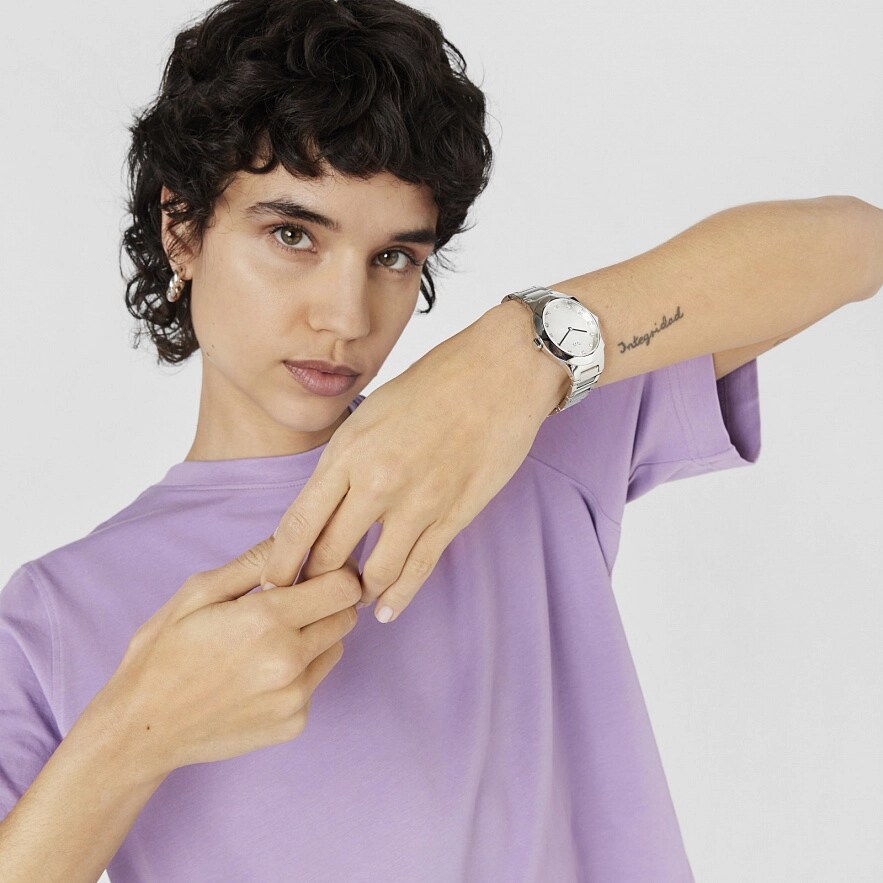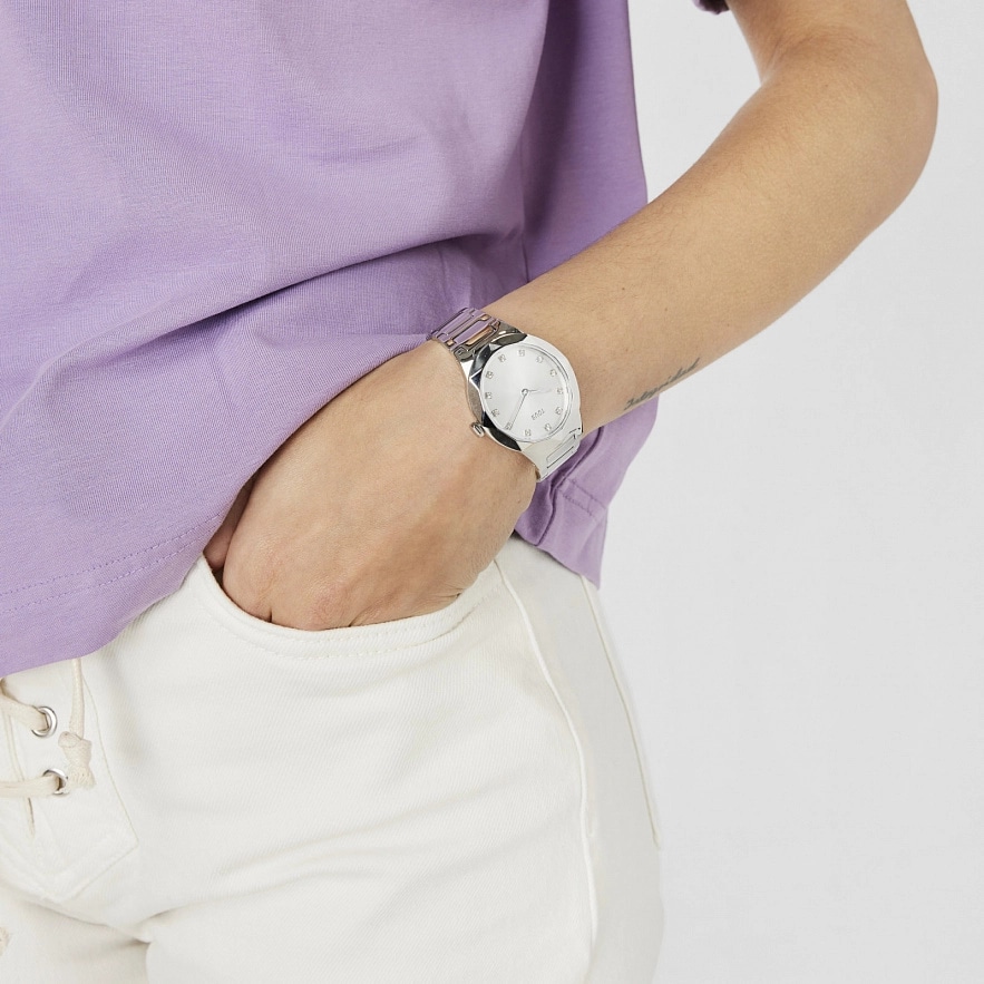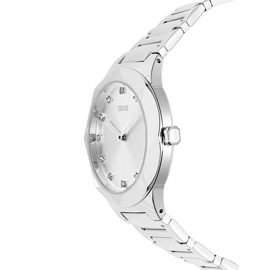 Годинник TOUS Karat Oval з ремінцем з нержавіючої сталі 316L, розміром 33 x 39 мм і металевим циферблатом з огранованими кристалами на цифрах. Функції: години та хвилини. Водонепроникність до 5 АТМ. Батарейка: 1,55 В, оксид срібла SR621SW / 0,30 г. Японський кварцевий механізм. Розкладна застібка з кнопками.
