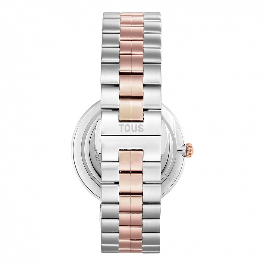 Годинник TOUS S-Band зі сталевим та рожевим ремінцем зі сталі IPRG 316L, діаметром 36 мм та металевим циферблатом. Функції: години та хвилини. Водонепроникність до 3 ATM. Батарейка: 1,55 В, оксид срібла SR621SW / 0,30 г. Японський кварцевий механізм. Розкладна застібка з кнопками.