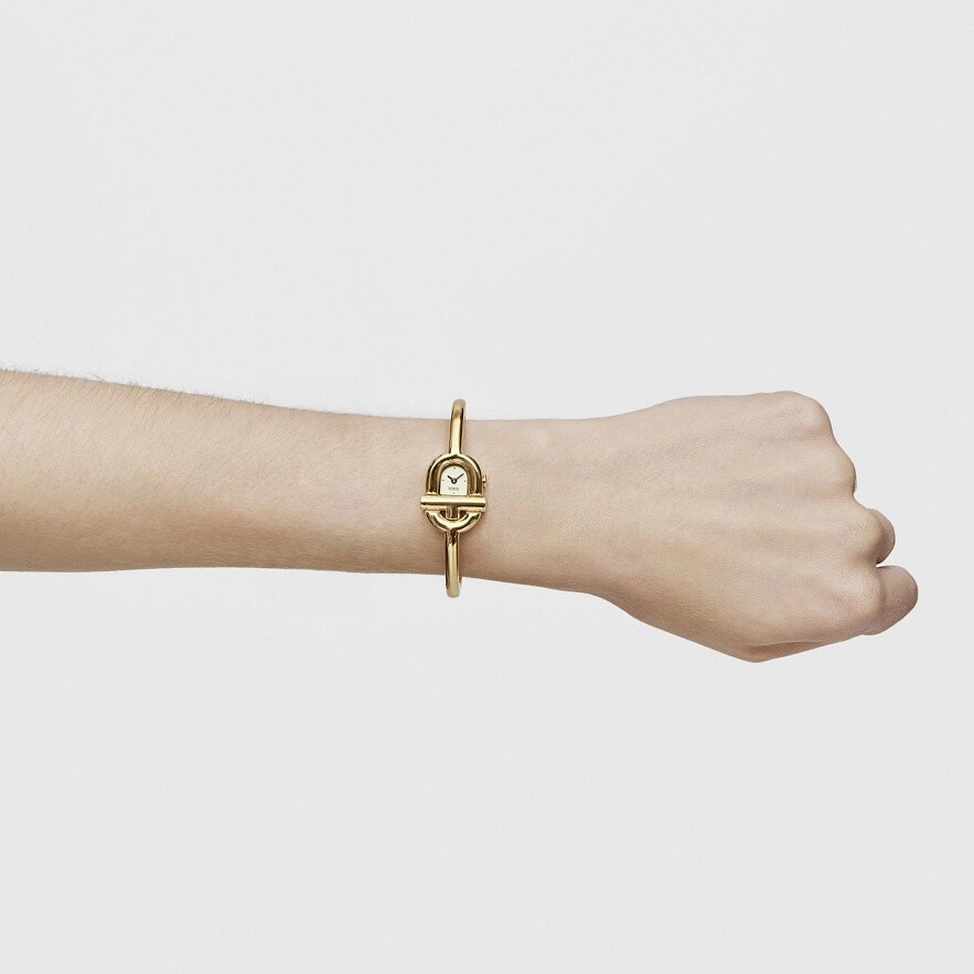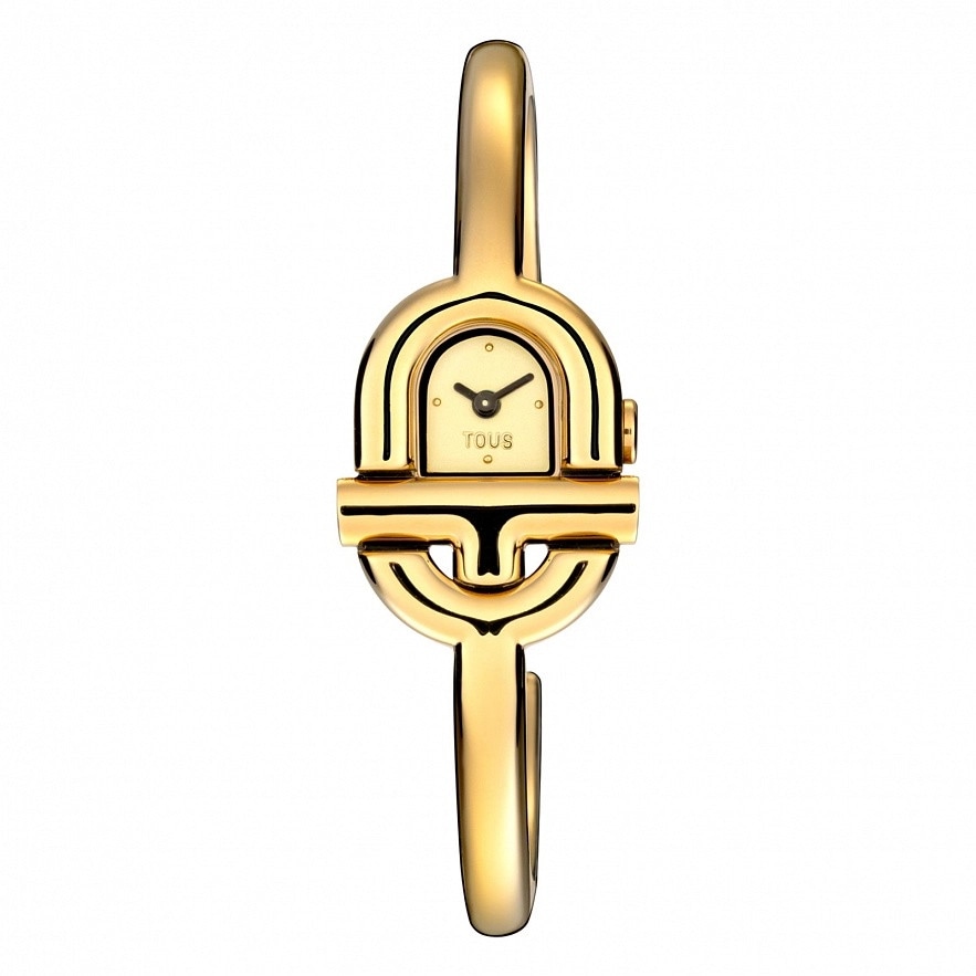 Годинник TOUS MANIFESTO з браслетом зі сталі IPG золотого кольору 316L. Розмір браслета: 56 мм х 50 мм. Розміри годинника: 21,1 x 24,7 мм, латунний циферблат. Функції: години та хвилини. Водонепроникний при 3АТМ. Акумулятор: 1,55В, оксид срібла SR521SW/0,2грам напівовальний плаский мінеральний кристал. Аналоговий японський кварцевий механізм.