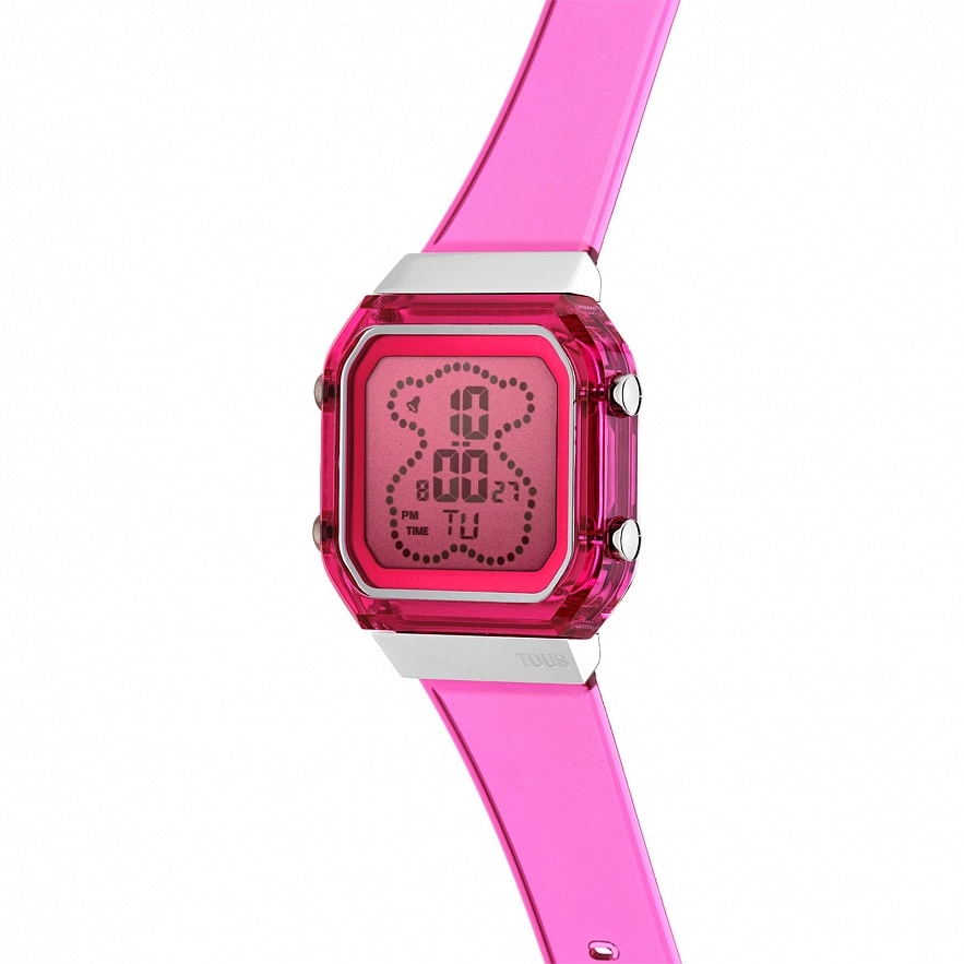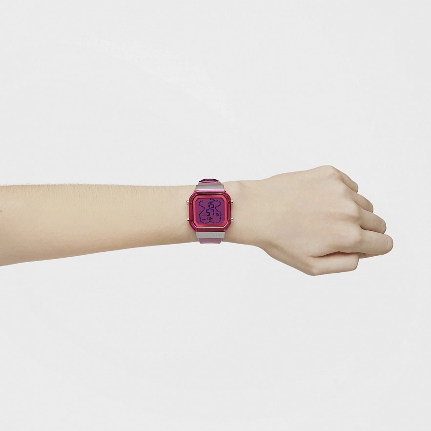 Цифровий годинник D-BEAR FRESH з корпусом і ремінцем з полікарбонату кольору фуксії в поєднанні з деталями з нержавіючої сталі. Циферблат: метал / рідкокристалічний екран (LCD) з підсвічуванням. Діаметр корпусу: 36,5 мм х 46,2 мм. Функції: годинник в 12 або 24-годинному форматі, хвилини, секунди, дата, місяць і день тижня, годинниковий механізм, секундомір 1/100 секунди, таймер зворотного відліку і 5 будильників. Водонепроникний до 3 ATM. Батарейка: 3 В літієва CR2025 / 2,5 грама (літій 0,045 грама). Калібр: CH1892. Кристал: квадратний плаский. Звичайна застібка зі сталевими петлями.