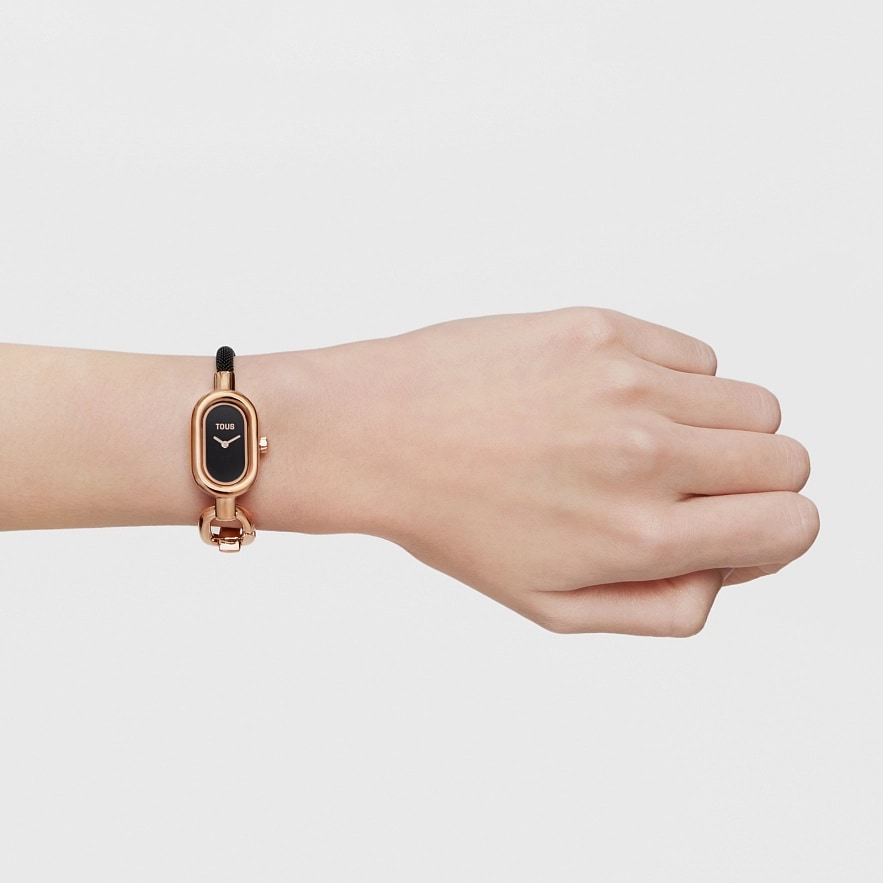 Годинник TOUS Hold Oval з чорним сітчастим браслетом з IP-сталі та рожевим корпусом зі сталі IPRG. Циферблат з чорного латунного металу. Розміри: 18 мм х 28,5 мм. Функції: години та хвилини. Водонепроникність до 3 АТМ. Батарейка: 1,55 В, оксид срібла SR521SW/0,2 грама. Калібр: MIYOTA 5Y20. Кристал: овальний плаский мінерал. Аналоговий японський кварцевий механізм. Ювелірна застібка.